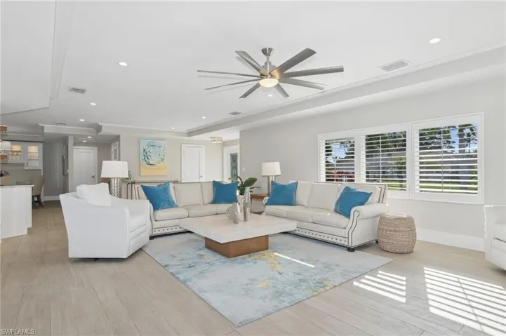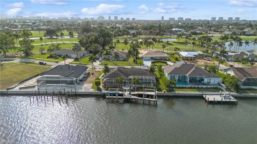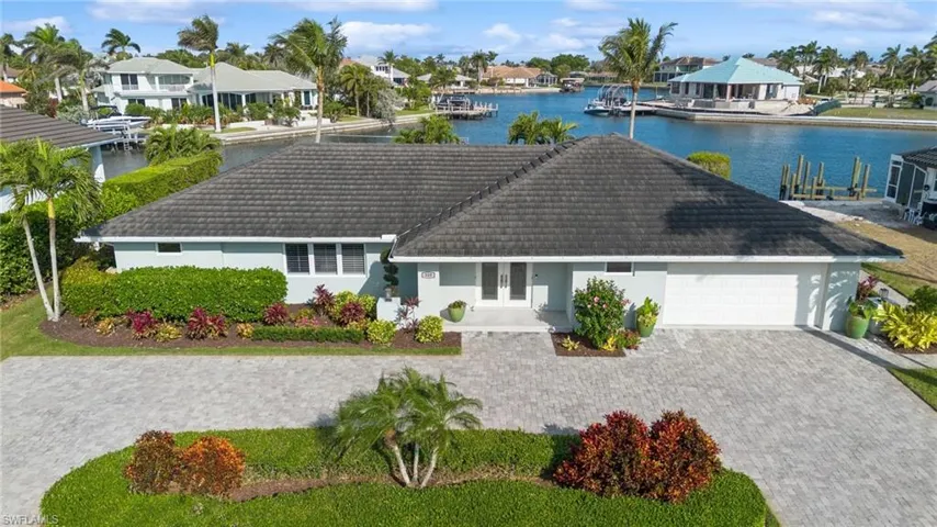 Wide converging waterway views from this gorgeous 3 bedroom, 2½ bath home. Extensively renovated in 2016. Open floorplan with room to entertain both inside and out. Enormous all-Thermador kitchen with custom walnut island, induction cooktop, steam oven and walk-in pantry. Spacious living room with wet bar and dual wine/beverage refrigerators. Large primary bedroom with serene bath, glass shower and dual vanities with natural stone. Custom walk-in closet with leather textured granite. Walls of sliders throughout, outdoor living with cedar ceiling and built-in heaters. Wide water views from the glistening pool and bright sunny lanai. Brand new waterfront patio and landscaping. Expansive dock with 2 lifts (20K & 10K). Impact windows and sliders plus electric shutters. Expanded garage with split AC. Laundry room with sink, custom drying rods and lots of cabinets. Raised ceilings, custom smooth stucco exterior, paver walkways and oversized 105×110 lot. Sold beautifully furnished. This waterfront home is very special – you won’t be disappointed.