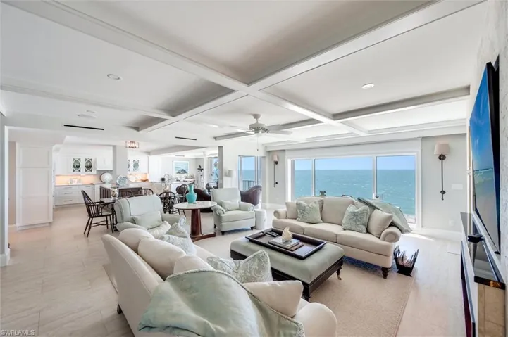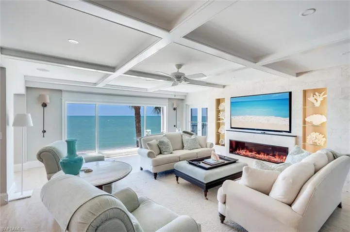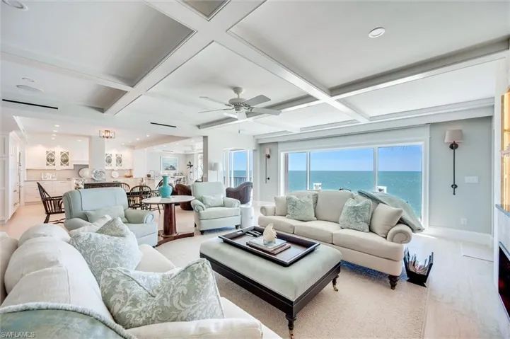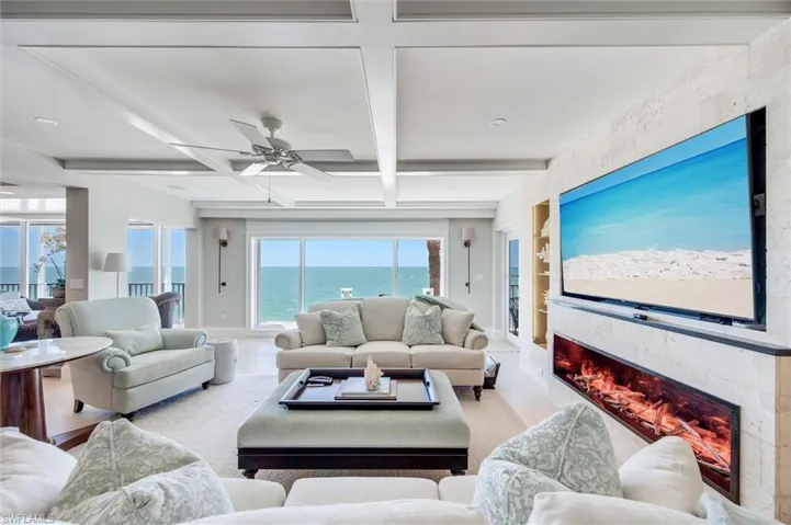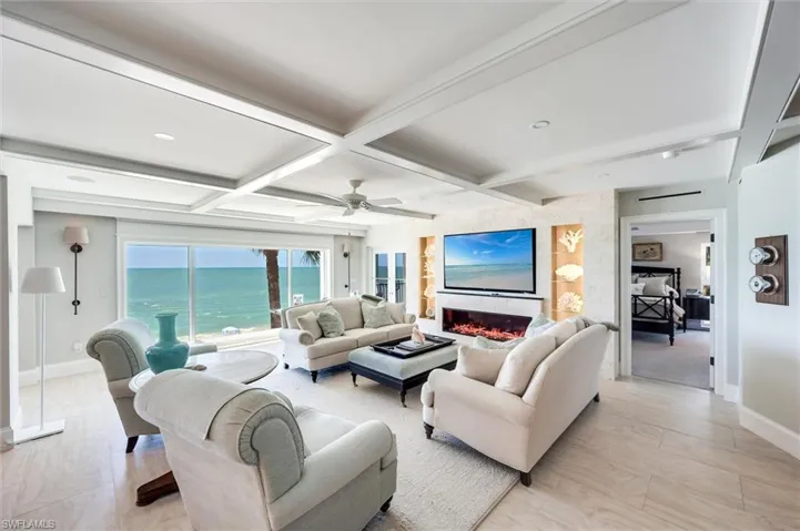 The Best Address in Naples! Rarely offered Beach Retreat, THE LAURENTIANS, located on Naples most coveted Beach- 60 feet of DIRECT PANORAMIC VIEWS, This complex is on 3.5 acres of White Sand -GULF FRONT. This 3rd Floor BEACH Home has been totally re-mastered from “WALLS IN” Nothing overlooked,Coastal contemporary High End Finishes.4 generous UNIQUELY climate controlled bedrooms, all en-suite , Listen to the surf from the Primary bedroom, 60 FEET of DIRECT captivating GULF VIEWS, State of the Art finishes, from Impact glass to remote window treatments layered for comfort. whole house purified water system, Generator, Coral animated fireplace. Superb floorplan of 3188 sq. feet under air structured for privacy and Beach-Life. Only 2 Units per floor, 2 Elevators for 16 Units. Under building garage parking,Large private store room. Located minutes from the New FOUR SEASONS Resort. Cross the street for breakfast at CHARLESTON SQUARE, Miles of Beach from your Door, North or South..On the Ground Level walk out to lushly landscaped patio area steps from the White Sand Beaches. Or sit at the Pool. LOW Density adds to the Mystique of the “MIRACLE MILE” stretch of this RARE Offerring.