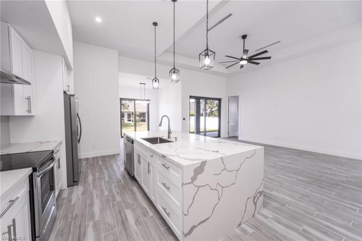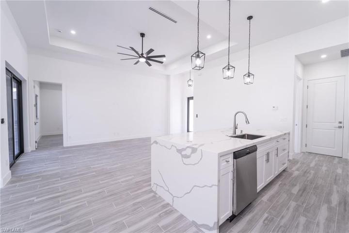 Stunning new construction Romana model home in desirable Cape Coral. 4 beds, 2.5 baths on approx. 10k sqft lot. Total 2,591 sqft, 1,812 sqft A/C. Open layout integrates kitchen, living, and dining. Quartz island, white cabinetry, nickel fixtures, stainless steel appliances. Solid doors, high baseboards, high ceilings. Bedrooms with closets. Luxurious quartz countertops in bathrooms and kitchen. Private patio, 3-ton A/C system for optimal cooling. Advanced septic tank, market-leading water filtering system. Ceiling fans in all rooms. Quality construction. Outdoor kitchen. Porcelain tile throughout the house. Hurricane windows, double front door. Don’t miss out!