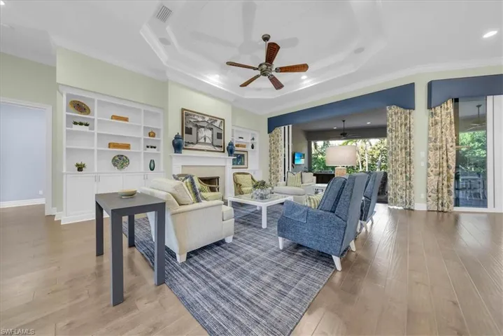Nestled on one of the Moorings most prestigious streets, step inside 455 Bow Line Dr where timeless sophistication meets modern coastal living. This impeccably custom designed 3 Bedroom + Den, 3 and a half Bath residence delivers an effortless luxury. Rich wood floors, tray ceilings, and a well-designed open floor plan creates a flow for both everyday living and entertaining. The chef’s kitchen features premium Thermador appliances, including a French-door refrigerator, triple combination oven, and built-in wine cooler, complemented by formal and casual dining spaces. With ease of indoor/outdoor living, enjoy your private outdoor retreat with covered expansive lanai, resort-style saltwater pool, outdoor kitchen, and lush custom landscaping. Additional highlights include a Control4 Smart Home system, TV lift, electric roll-down screen with hurricane shutter, upgraded lighting, and extensive enhancements throughout. Built in 2015, this home showcases quality craftsmanship and modern efficiency. Enjoy optional private Moorings beach access and a prime location just minutes from world-class dining, shopping, and Naples’ iconic white-sand beaches. A short stroll or bike ride takes you to the Gulf, passing beneath a picturesque canopy of mature banyan trees—one of the Moorings’ most beautiful and sought-after streets.