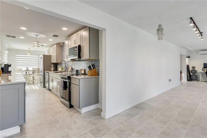 Ft. Myers Beach and 2 miles from Times Square. Step inside to discover a charming living space featuring tile throughout, fresh interior paint, and custom electric zebra blinds throughout. The completely remodeled kitchen shines with sleek quartz countertops, stainless steel appliances, custom cabinetry, and a stylish backsplash – perfect for casual dining or entertaining.