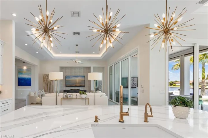 Outdoor living reaches new heights on the expansive lanai, where you can watch manatees and dolphins play in the canal. The covered area with picturesque water views and a motorized privacy screen is perfect for ultimate relaxation. The outdoor oasis continues with a pool, spa, outdoor grill, and seating area overlooking the serene waters. For boating enthusiasts, a new 998-SF Azek dock includes a 7,000-lb lift for jet skis, a 14,000-lb boat lift, plumbing with two faucets and a fish cleaning station.