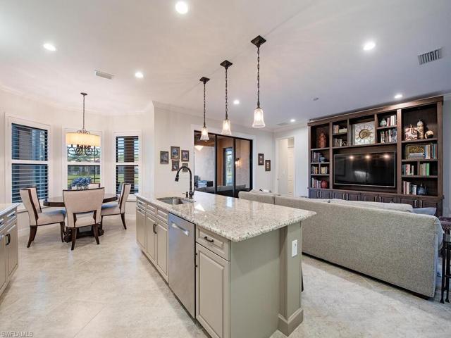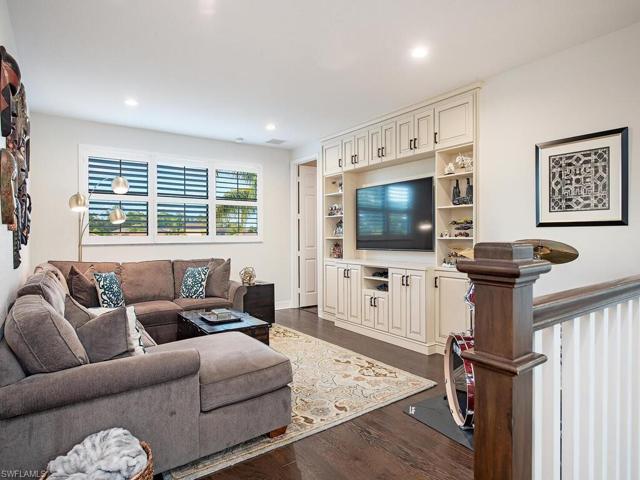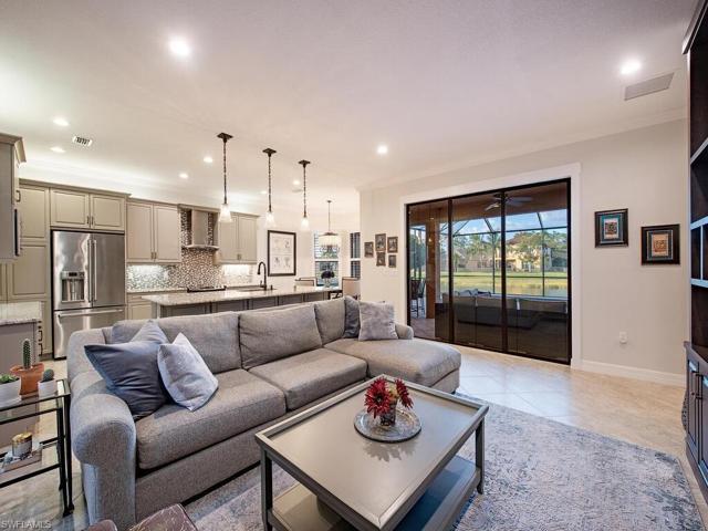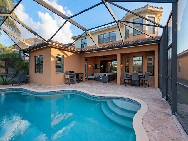H12611. Welcome to this pristine & exquisitely crafted home offering an exceptional combination of space, custom finishes & the Naples lifestyle you’ve been dreaming of. Everyday feels like a vacation as you take a dip in the saltwater pool or dine al fresco in the screened lanai all while enjoying a sparkling lake view. A grand 2-story foyer welcomes you to formal living & dining spaces. The gourmet kitchen opens to a family room with wine bar…perfect for entertaining. Move right in & immediately enjoy living in paradise as this home has every feature you could possibly want. 1st floor primary suite is a sanctuary with fully remodeled spa-like bath including freestanding tub & incredible walk-in shower. Stay organized with finished closets, 3 stylish built-ins, a Murphy bed, custom laundry & garage storage. Additional features include fresh interior paint, plantation shutters, crown molding, designer lighting, finished garage floor & wood & tile flooring throughout. With 3,215 sf, 5 bedrooms & a loft this Merlot floor plan easily accommodates family & guests. Riverstone offers a social, vacation-inspired lifestyle with extensive amenities, activities director & A-rated schools.