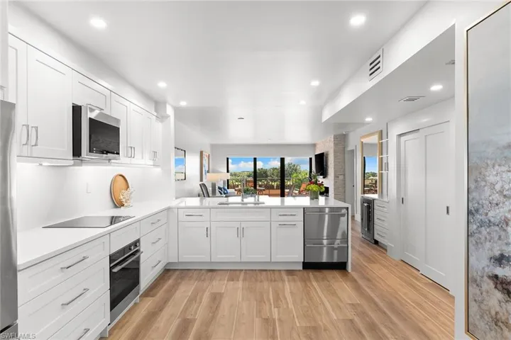 This turnkey Penthouse suite is an extraordinary residence inside the pristine Hyde Park community – coveted for incredible lake and golf course views, year-round panoramic sunsets, and ideally located near the Commons beach tram for direct access to Pelican Bay’s world-class amenities. Newly renovated by a luxury builder and furnished by Clive Daniel, walls were removed and ceilings raised to provide maximal space and function for modern living. This unit lives like a three bedroom condo – two spacious bedrooms and ensuite baths plus a comfortable den that easily converts into an optional third bedroom for extra guests. The centerpiece gourmet kitchen features custom white shaker cabinets and a breakfast bar with quartz countertops and premium Fisher & Paykel appliances. A separate dining and living room area is flanked by a modern vapor fireplace and custom beverage bar with built-in wine cooler – ensuring optimal entertaining. Your eyes will be drawn to the massive balcony terrace offering endless views which span the Gulf, fully embracing the essence of coastal luxury living. Completed with thoughtful consideration to every important detail – hurricane impact windows and doors, recessed lighting, seamless electric shades, pex plumbing, Kohler fixtures, premium decorative tiles, flooring, carpeting, custom closets and on. A large storage room and designated parking near the elevator complete everything you need to move right in and begin living your very best life today.