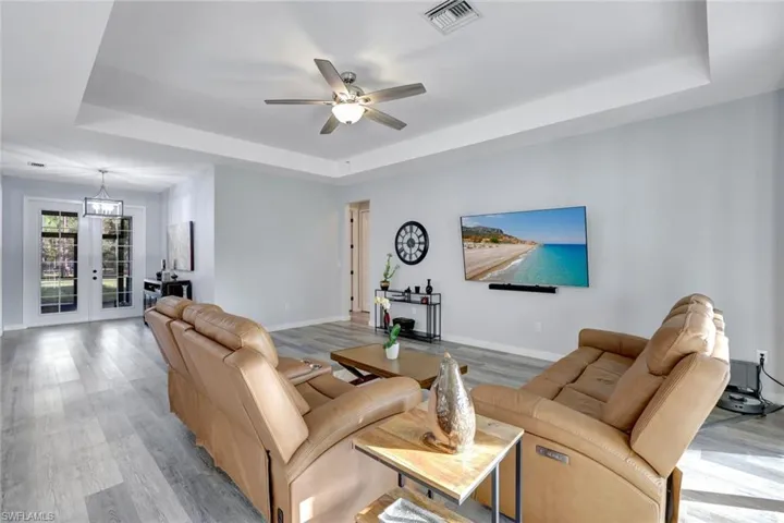 Discover this rarely available lakefront home in the Estates, offering stunning views and unparalleled tranquility! Newly built in 2019, this impressive residence sits on 2.5 acres and boasts 3 bedrooms plus a study, 2 full baths, and a spacious 2-car garage. The property features a fenced yard with a private gated entrance for added security and privacy. Enjoy a thoughtfully designed open floor plan that includes both a front and rear screened lanai, perfect for entertaining. The home is equipped a variety of smart home technology, high-impact windows and sliders, upgraded flooring, and a whole-house Kinetico reverse osmosis water filtration system. Additionally, there’s a whole-house generator hookup, a custom cypress ceiling at the entry, and elegant shaker cabinetry with quartz surfaces throughout. The exquisite owner’s suite offers custom built-in lighting, a luxurious master bath with dual sinks, and a sprawling walk-in frameless glass shower alongside a spacious closet with upgraded built-ins. For outdoor enthusiasts, the grounds are truly a paradise, featuring numerous fruit trees, a cozy fire pit, ample room to explore, a free-standing shed for equipment storage, and access to a freshwater lake, perfect for fishing and a variety of outdoor activities. CCPS shows top rated schools in the area. Close proximity and quick accessibility to shopping, dining venues and new exciting developments coming to the area. Imagine the endless possibilities this exceptional property has to offer!