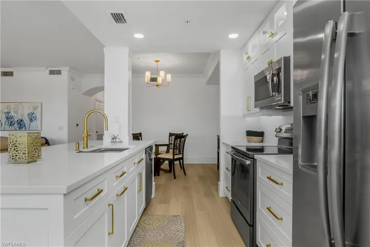 The redesigned kitchen is the heart of the home, showcasing $20,000 in custom cabinetry from floor to ceiling, sleek quartz countertops, a large stainless-steel sink with upgraded faucet, Jeffrey Alexander hardware, and a built-in wine cooler and dry bar. A removed kitchen wall now creates a more open, airy flow, while designer chandeliers and enhanced electrical work provide an elegant finishing touch. Luxury vinyl flooring stretches throughout, complemented by taller baseboards and wider door trim for a refined look. The living area is anchored by a stunning custom tile TV and fireplace feature wall, making it a perfect space to relax. Freshly painted walls, ceilings, and trim enhance the light and bright atmosphere, while an upgraded screen door at the entrance welcomes breezes inside. Even the laundry room has been elevated with additional cabinetry for storage and convenience. As a bonus, the contractor has a piece of matching quartz available should the new owner wish to upgrade the bathroom counters. The screened lanai has an updated light and fan and offers breathtaking views of the lake and Rookery Bay Preserve, perfect for enjoying a morning cup of coffee or relaxing after a fun filled day in the community.