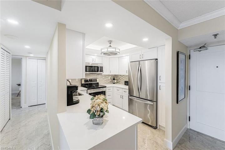 Immerse yourself in the newly remodeled elegance of this beachfront condo on Marco Island, offering a priceless long view down of Marco’s crescent shaped beach. This exquisite residence has undergone a comprehensive makeover, featuring new flooring, a completely renovated kitchen, a modernized master bathroom, and fresh furnishings throughout. Its Tower one south side location ensures unobstructed, optimal exposure and frames the stunning beach vistas beautifully. Each room, including the two bedrooms, is equipped with new high-impact glass sliding doors and storm shutters, opening to the expansive lanai and inviting the outside in. These renovations, along with the modern stainless steel appliances and crown moldings, establish this property as a distinctive and meticulously maintained home. Residents enjoy top-notch amenities including 24/7 security, boat slips, tennis and pickleball courts, and more, all within close proximity to local attractions. The upgrades to the lobby, fitness room, and mailroom to further enhance the living experience. This condo isn’t just a home; it’s a portal to paradise.