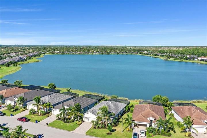 Enjoy your favorite libation while poolside as you watch the sunset from this amazing westerly facing lanai that is framed by a tropical landscape. A simpler life greets you with a 3 Bedroom single level living 2019 built home with 2 car garage and lots of storage! This open floorplan flows from the cozy front porch into the open and airy heart of this home and an expansive lakefront view. The kitchen with its spacious island, tile backsplash, granite counters, and under counter lighting is a cook’s delight. The walk-in pantry provides great storage. Drenched with natural light, the space is complemented by tasteful, modern lighting fixtures. The primary bedroom with two walk-in closets and ensuite bath with both a shower and soaking tub is a private oasis. The home has two additional bedrooms with their own baths for your guests’ comfort. Plantation shutters and crown molding create a luxury, beach feeling. Across from the saltwater heated pool is a stunning 40-acre lake. Step outside to a comfy seating area wired for TV with electric hurricane shutters. Bonita Landing -easy access to spend the day at Bonita or Naples beaches or out shopping and come home to your own paradise!