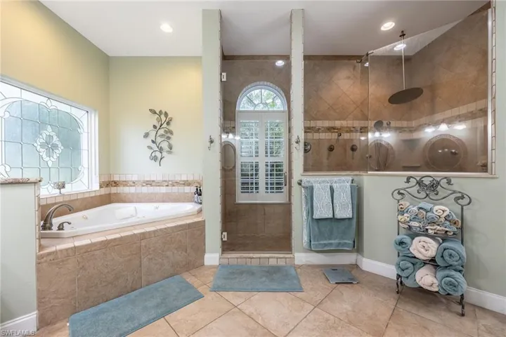 The first-floor master suite is a luxurious retreat, complete with a fireplace, ceiling fans, darkening blinds, and oversized his-and-her walk-in closets. The spa-inspired master bath includes a soaking tub with stained-glass accent window, a glass-enclosed shower with body jets, rain head, and handheld shower, dual granite vanities, a makeup vanity, tile flooring, and custom cabinetry.