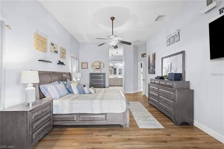 A new roof installed in September 2018 ensures both durability and aesthetic appeal. The paver driveway and fenced yard provide privacy and security for your family. As you enter, you’ll be greeted by double French doors that open to a flowing floor plan. Luxury Vinyl flooring adds contemporary style to the bedrooms, living room, and kitchen. Elegant porcelain ceramic tiles adorn the bathrooms, enhancing the space’s overall elegance. Vaulted cathedral ceilings and generous sliding glass doors flood the home with natural light, offering serene views of the pool and newly installed pool cage.