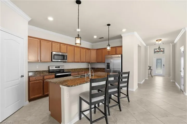 Tucked inside a beautifully maintained gated community, this refreshed 2016 Trevi model offers over 2,000 sq ft. Featuring 4 bedrooms and 3 baths. BRAND NEW carpet in the bedrooms and fresh interior paint make this home move-in ready. The DRIVEWAY was WIDENED BY 10 FEET to accommodate 3 CARS and THE SUNSETS ARE AMAZING!! The master bedroom offers two large closets and peaceful lake views, while the fourth bedroom with en-suite bath is ideal for guests or extended family. The centrally located kitchen features a large island, ample cabinetry, plenty of counter space, and a generous pantry. Bonus: REVERSE OSMOSIS system for fresh drinking water everyday and NEW WATER HEATER. Enjoy serene lake views and resort-style amenities including a clubhouse, fitness center, pool, tennis, pickleball and basketball courts, and a playground. Conveniently located near shopping, dining, I-75, RSW Airport, hospitals, and spring training stadiums. Favorable assumable flood policy available. PLEASE Wear Booties as carpet is brand new and tile was just cleaned.