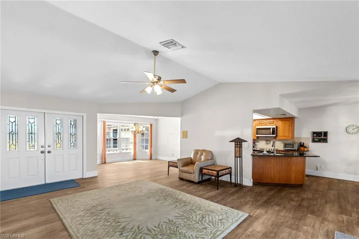 Experience the best of waterfront living in this 3-bedroom, 3-bathroom single-family home in Cape Coral, offering 1,788 sq. ft. of comfortable living space with rear eastern exposure overlooking a large lake. Enjoy breathtaking views from your private boat dock, with a seawall ensuring long-term stability and direct water access for boating and fishing. Built for both beauty and durability, this home features impact-resistant windows and shutters for hurricane protection, a newer roof, a two-car garage, and mature landscaping that enhances its tropical charm. With no HOA restrictions, you have the freedom to make this waterfront retreat your own. Conveniently located near shopping, dining, and entertainment, this home is perfect for full-time residents, vacationers, or investors looking for a prime lakeside property.
