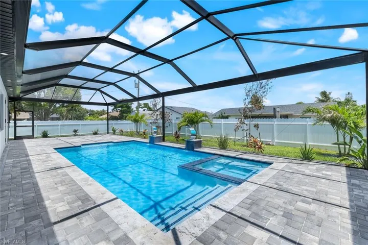 Welcome to Your Dream Retreat positioned in the desired Pelican area! This stunning new construction pool and spa home offers the perfect blend of elegance, comfort, and functionality. Featuring 4 spacious bedrooms, 3 luxurious bathrooms, and a 3 car garage with a wide doublewide driveway, there’s plenty of room for family, guests, and entertaining.From the moment you step inside, you’ll be captivated by the impeccable craftsmanship and upscale finishes. The heart of the home is a gourmet kitchen adorned with quartz countertops, premium appliances, a bar area, and a wine cooler a true chef’s delight. The open concept layout seamlessly connects to the expansive great room, accentuated by tray ceilings, three panel sliding glass doors, and large windows that flood the space with natural light. The owner’s suite is a private sanctuary, featuring dual vanities, a luxurious walk-around shower, elegant upgraded mirrors, and a soothing soaker tub. Enjoy custom wood shelving in the walk in closets, 32-inch tile flooring, and soaring volume ceilings throughout the home. Step outside into your own private paradise a resort style saltwater pool and spa set on a beautiful pavered deck, complete with an outdoor grill with quartz countertops and a convenient outdoor shower. Highlights of this home is screened enclosure, impact windows and doors, sprinkler system, epoxy coated garage floor, washer and dryer included and professionally landscaped yard with lush Floratam sod and majestic Sylvester palm trees add both beauty and function. Conveniently located near shopping, dining, and everyday conveniences, 10min away from Cape Coral’s biggest waterpark SUN SPLASH, TARPON POINT MARINA, MARINA VILLAGE SHOPS RESTAURANTS, CAPE CORAL DOWNTOWN & MORE. This exquisite home delivers the ultimate in luxury living.