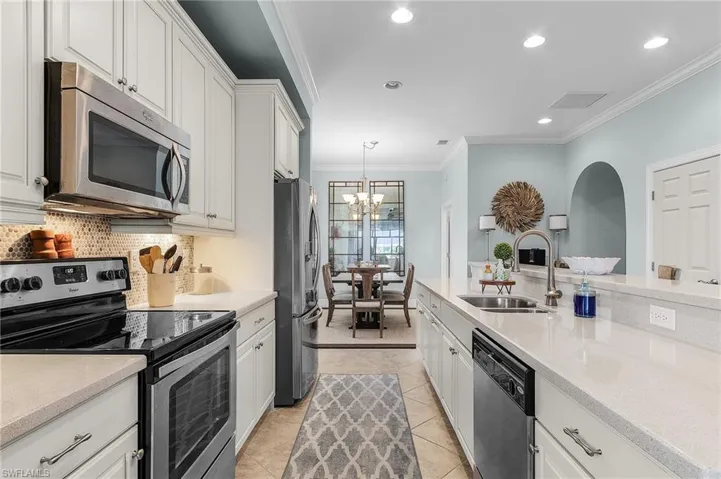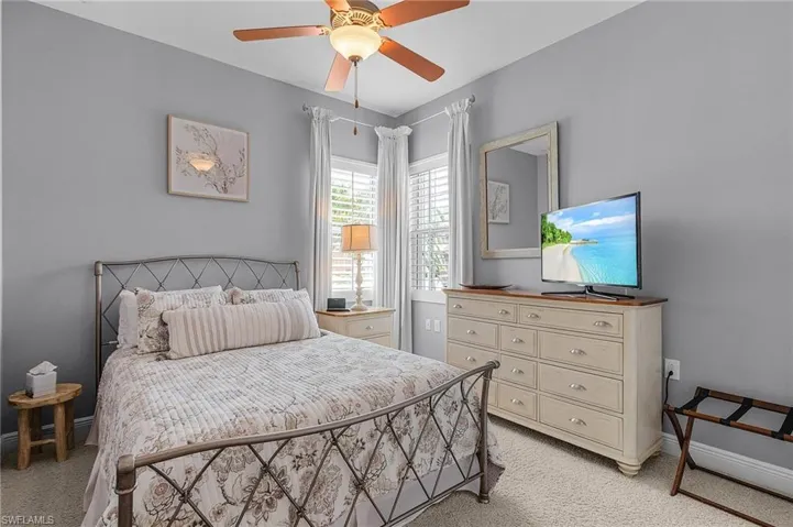 From the moment you step inside you will feel the exceptional upgrades to this home. The bonus is a great location with water, golf course and sunset views all to be enjoyed while floating in the pool, relaxing in the hot tub or sitting under the covered Lanai with beautiful tongue and groove ceiling. Many of the upgrades in this Carrera floor plan include: Plantation Shutters throughout, Crown Molding, Coffered ceiling in the Living Room with Shiplap wall with electric fireplace/mantel. The Kitchen has upgraded cabinets, shelves that slide and additional Shiplap walls. Wood flooring has been added to the Primary and one Bedroom and diagonal tile throughout. Additional features include: StormSmart electric shutters on Lanai and Primary bedroom with Accordian shutters on other windows. Monkey bar garage storage, sink and cabinets in the laundry room, Nest security camera, doorbell and thermostat, landscape uplighting throughout exterior with landscape curbing around the entire home. Key Updates: Kohler faucet (2025). Whole house re-plumbed, water main shutoff moved to garage interior, hot water heater, interior re-painted and Kitchen backsplash (2024). A/C replaced and roof cleaned (2023). Garbage disposal and water line spigot added to lanai (2022). House exterior re-painted (2021). Added exterior protection includes Gooseneck vents replaced and Baffles installed on the attic vents. Mirrors in Dining Room, Dining & Living Rm rugs and TV’s will convey with the home! Other optional pieces for sale in separate bill of sale. This is like a brand new home where you can move in, have no worries and start to enjoy the incredible resort lifestyle. Pelican Preserve is a nationally recognized active adult 55+ community with endless amenities including the Flip Flops outdoor restaurant, 3 pools, Tennis, Pickleball, Bocce, Softball, Fitness, Movie Theater, Billiards, Hobby Rooms, Amphitheater, Destinations indoor restaurant, plus many special events throughout the year. The Brokke Center includes a Library, Business Center, Card Rooms and Coffee Center for socializing with friends. There is a 27 hole Private Golf Club with optional memberships. Pelican Preserve is a short drive to RSW Airport, many shops and restaurants and the gulf coast beaches. It’s time to call this lovely property your home.