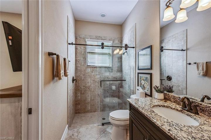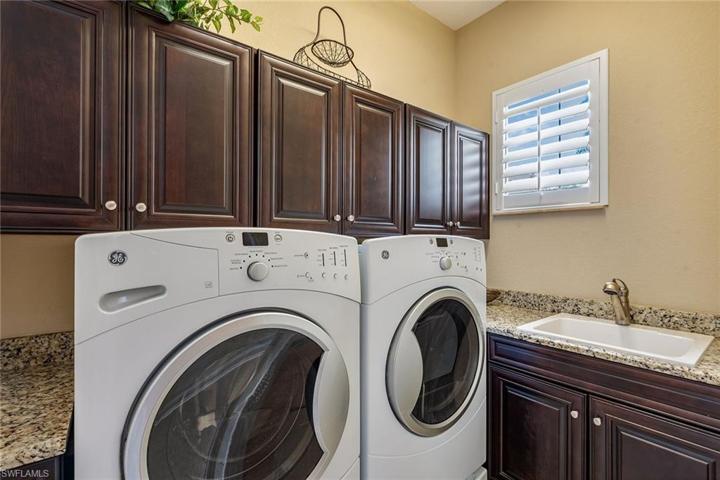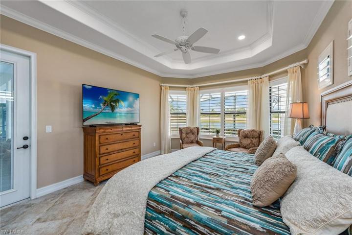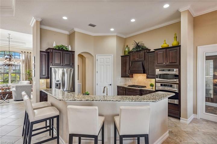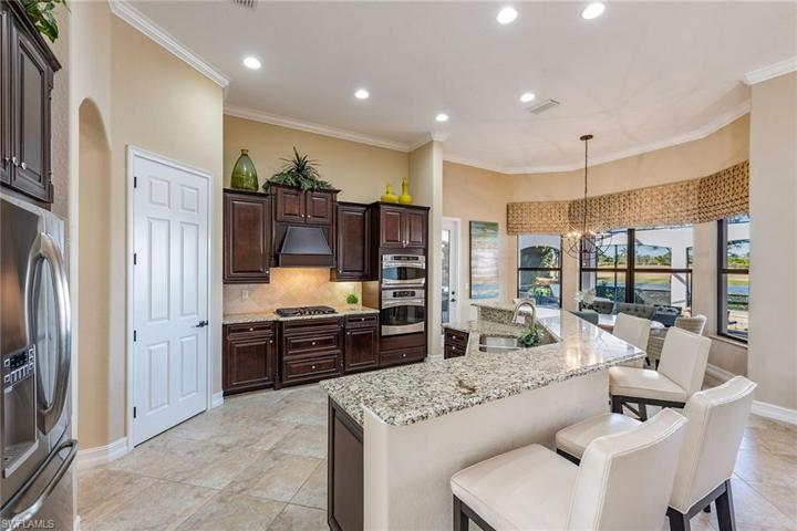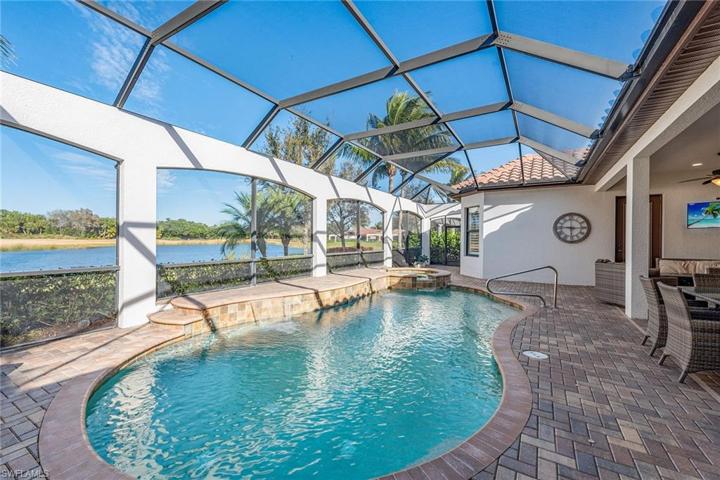 Golf memberships available in Fiddler’s Creek – brand new luxury golf clubhouse to be completed this year! Nestled within the popular Runaway Bay neighborhood, this immaculate Bougainvillea residence was designed to showcase stunning vistas of the serene lake and lush golf course. The home boasts an expansive open great room floor plan accentuated by 4-bedrooms and 3-bathrooms. Upon entering through stately double doors, you’ll be greeted by 12-ft tray ceilings, crown molding, transom windows, plantation shutters, tile flooring and a beautiful view of the pool and outdoors. The great room features a dry bar and direct lanai access. The kitchen is adorned with quality cabinetry, granite counters, a center island, wall oven, French door refrigerator with ice maker, walk-in pantry, stainless appliances, gas cooktop and eat-in area overlooking the pool. Outside, the extended colonnade screen enclosure features a heated pool and spa with waterfall, pool bath, and an outdoor kitchen, complete with built-in gas grill, sink, refrigerator and large island, all overlooking the stunning golf course and lake views. Laundry room with oversized front load washer and dryer, sink and storage cabinets. Additional noteworthy features include impact windows and doors, tankless water heater, designer lighting and fans, makeup vanity in master, linen closet, and a paver driveway leading to a 3-car garage with epoxy flooring and overhead storage racks. New AC in 2019. Fiddler’s Creek residents enjoy state-of-the-art fitness center with an extensive class schedule, tennis and pickleball with clinics, leagues and lessons, bocce, spa services, hot tub, sauna, steam room, fine and casual dining, a resort-style pool with waterfalls and slides, and an extensive activity and event calendar with activities of all types for all ages and interests. Optional golf, beach, and marina memberships available. The beautiful furnishings are negotiable.