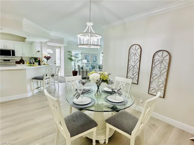Beautifully updated first-floor corner unit offering 3 bedrooms, 2 bathrooms, and a detached garage. This well-maintained home features numerous recent upgrades, making it move-in ready for seasonal or full-time living. The home features all-new LVT flooring throughout, complemented by custom 5¼-inch baseboards, fresh paint on all walls, ceilings, and crown molding in the main living areas. Updated lighting and modern ceiling fans add a clean, contemporary touch throughout. The kitchen features stainless steel appliances, including a Bosch dishwasher and LG microwave, along with an updated faucet and garbage disposal. Both bathrooms have been upgraded with new tile flooring and fixtures, while the master suite features a completely remodeled shower (2025) with oversized 14 x 29-inch tiles and a waterfall design, creating a spa-like retreat. Additional improvements include a new A/C system (2024), brand-new hurricane-impact windows and sliders (approximately a $45,000 investment), new light fixtures, and updated finishes throughout. The MyQ Wi-Fi-enabled garage door with camera allows for convenient remote access and secure package deliveries.