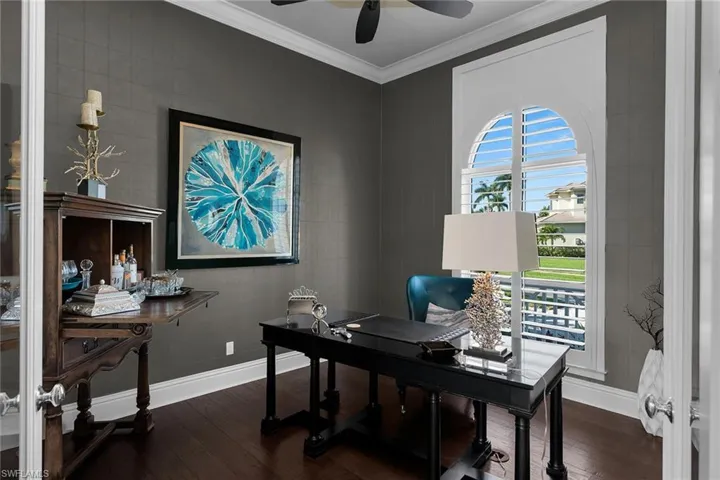 This fabulous coastal-inspired home is uniquely situated to capture gorgeous views out to the Marco River and converging waterways. Home embodies a sophisticated Palm Beach-inspired coastal design blending classic Florida elegance with a fresh and airy interior. A serene palette of soft aqua, turquoise and crisp white reflects the natural beauty of the surrounding coastal landscape. Open concept with a seamless flow connects the interior and exterior spaces. Living and formal dining areas balance the open concept with distinct functional spaces, creating harmonious, welcoming spaces for relaxation and entertaining. The functional layout allows the hostess to remain fully engaged with guests. Gourmet kitchen will delight the family chef with high-end finishes, Sub-Zero and KitchenAid appliances, center island, quartzite countertops, ample storage, coffee bar and butlers’ area. Luxurious primary suite affords water and pool views, spa-like bath, free-standing soaking tub, large walk-in shower and sizable wardrobe closets. Three privately located guest suites with a gathering space provides ample space for visiting family and friends on the second level. Direct access boating, kayaking and paddleboard opportunities to the Gulf and endless waterways are yours to discover. Sparking pool with a sun shelf to catch some rays or for the youngsters. Dock with 7,500-pound lift will accommodate 20- to 30-foot vessels. Dockside sitting area adds another versatile space. Watch the dolphin play in the shimmering waters. Superb quality appointments include, hand scrapped hickory and tile flooring, elaborate detailed ceiling treatments for added visual interest, plantation shutters, crown moldings, quality cabinets, soaring ceilings with full height glass to maximize amazing water views, central vacuum, wine cooler, beverage center, electronic blends, rolldown screens, full-house generator, full storm protection, three-car air-conditioned garage, lush tropical landscaping and more. Meticulously maintained. A special opportunity for the discerning home buyer who wants it all!