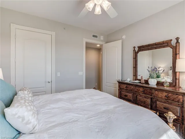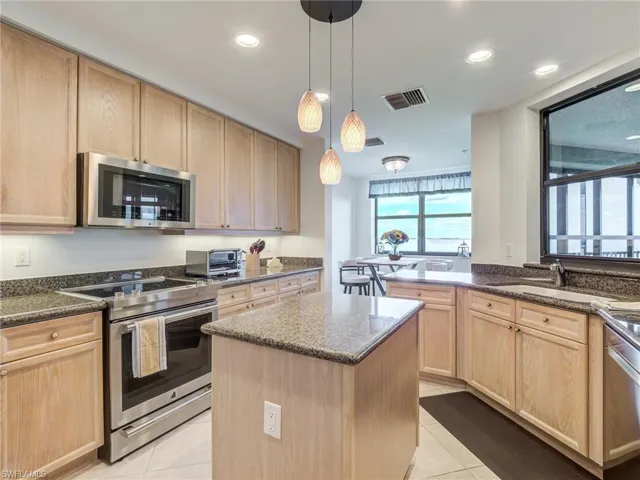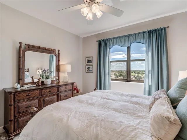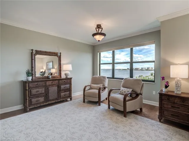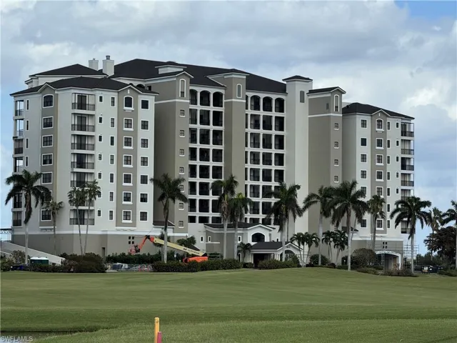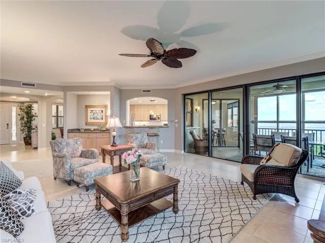 Located in the highly sought after Palmas Del Sol community in Gulf Harbour, this breathtaking 6th floor end unit offers unobstructed views to the north and east providing wonderful natural light, sunrise, and evening skies. This stunning over 2500 square foot unit is located in building three of Palmas del Sol. The Alahambra model is an open concept design featuring two bedrooms plus den, 2.5 bathrooms, eat-in kitchen, breakfast bar, and great room. The kitchen features granite counter tops, a center island, pantry, and brand new Jennair stainless steel range and microwave. The oversized primary bedroom has a stunning view of the river and features a front facing balcony that overlooks the golf course. This bedroom suite has wood floors, a large sitting area, and a newly renovated bath with dual vanities, soaking tub, separate shower, linen closet, and a custom designed walk-in closet. The lanai is fully enclosed with access to both kitchen and great room. Unique to high rise living, this unit offers a full two car garage located on the second parking level with easy access to elevator. Golf Membership available for purchase.