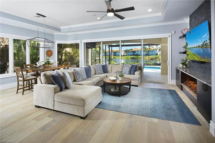 Welcome to this remodeled lake-to-golf view home in the heart of the exclusive country club community of Grey Oaks. This 4-bedroom plus study, 3.5-bath home has been tastefully renovated to be an open great room plan perfect for entertaining friends and family. The gourmet kitchen features a spacious island with white quartz countertops and includes Wolf and Sub-Zero appliances with additional beverage drawers, wine cooler and ice maker. The open concept includes luxurious wide plank white oak flooring throughout, a 16-foot slider opening, and a large picture window overlooking the reimagined outdoor living space with a nearly 40-foot covered lanai with pool and spa beyond. The pool and deck have been completely updated and the new screen enclosure features a full-width picture window expanse to take in the long-range lake and golf views while relaxing outdoors. Additional features of this magnificent property include a new roof in 2022 and AC in 2023, tankless water heater, custom closets and a completely updated primary bath and guest baths. A world of luxury awaits you in the upscale Grey Oaks Country Club located minutes from Old Naples with 54 holes of golf and world-class amenities.