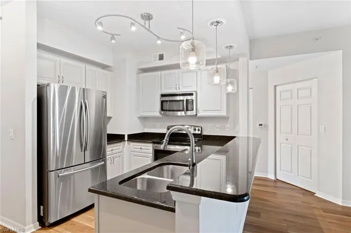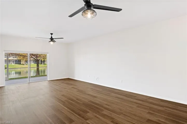 Located in the sought-after Casa Di Fiori community in North Cape Coral, this first-floor coach home offers a combination of comfort, functionality, and serene lake views. Featuring 1,273 square feet of living space, the residence showcases a desirable great room layout with split bedrooms, three bedrooms, and two full bathrooms—ideal for both everyday living and hosting guests. Luxury vinyl plank flooring runs throughout the home, creating a cohesive and modern feel. The kitchen is both stylish and practical, appointed with dark granite countertops, crisp white wood cabinetry including an oversized pantry cabinet, and stainless steel appliances. The open living space extends to a spacious screened lanai overlooking the lake, providing a peaceful setting for morning coffee or evening relaxation. A detached one-car garage adds convenience and is outfitted with heavy-duty storage shelving. The unit is located outside of a flood zone and includes storm shutters for added peace of mind.Casa Di Fiori is known for its well-maintained grounds and impressive amenities, including a resort-style pool, tennis and pickleball courts, fitness center, clubhouse, and bocce ball court. CLOSE TO FT MYERS and Conveniently located near shopping, dining, and major roadways, this home delivers an easy, low-maintenance lifestyle in a welcoming community.
