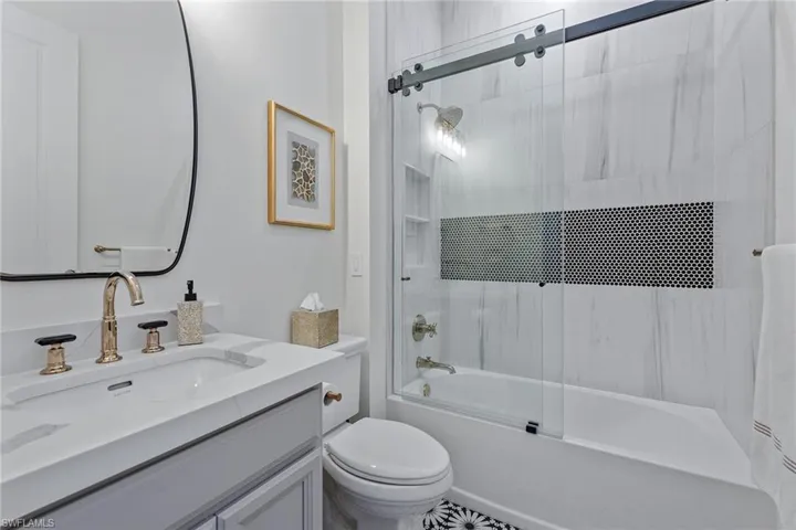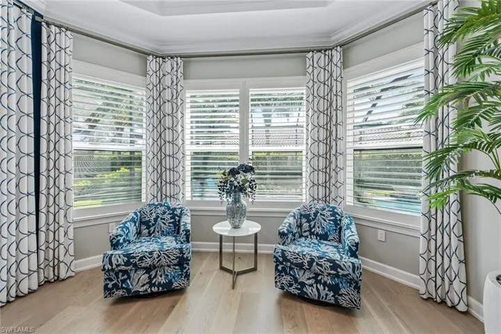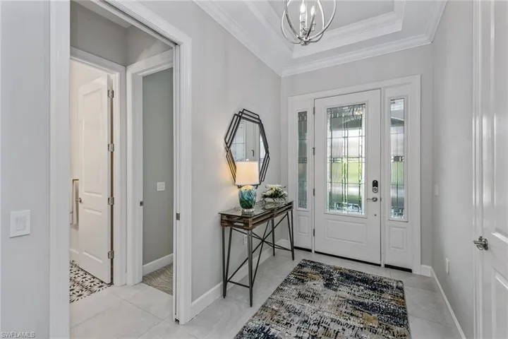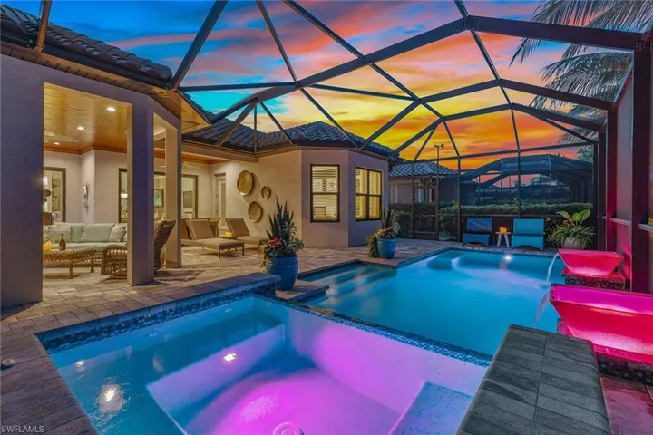 Welcome to this exquisitely decorated, extensively upgraded and immaculately maintained residence, in the Mussorie village of the regarded Fiddler’s Creek community. An open floor plan offering three bedrooms plus a den, three baths and a two-car garage, this exceptional Lazio residence combines high-end furnishings with thoughtful high-quality custom details for effortless luxury living. Surrounded by lush landscaping, this refined home features a tile roof, sealed paver driveway, and new PGT impact windows/sliders (2023) with a transferable warranty. Recent updates to impress even the most discerning buyer include a new HVAC system (2025), new flooring throughout most of the home, renovated baths, upgraded lighting and a freshly painted interior. Inside, porcelain tile flooring flows through the living areas, complemented by crown molding, recessed LED lighting with new trim, art lighting, custom ceilings, white plantation shutters, Sonos sound system, screwless switch-plate covers, and custom designer drapery. The open kitchen is a chef’s dream with quartz counters, under-cabinet lighting, new tile backsplash, walk-in pantry with wood shelving, and a large island with pendant lighting. Premium GE Café stainless appliances include a natural gas cooktop with hood, convection wall oven, Advantium microwave, French door refrigerator with hot water dispenser, dishwasher, and a Bosch under-sink tank for instant hot water. The dining area features mica wallpaper; the living area is enhanced by decorative molding. The private, oversized paver lanai is an outdoor oasis with an upgraded E-Peck Cypress tongue-and-groove ceiling, gas fireplace, and a full custom summer kitchen equipped with Blaze stainless grill, cooktop, beverage refrigerator, Trade-Wind hood, and quartz counters and backsplash, all highlighted by under-counter LED lighting and bar seating. The heated pool/spa features spillover bowls, new LED lighting and a new pump, all within a screened cage and enhanced by upgraded landscaping and lighting. The owner’s suite is a private retreat with bay windows, toe-kick lighting, oak veneer plank flooring and lanai access. The luxurious en-suite bath offers a frameless glass shower with multiple shower heads and dual niches with pebble tile, dual quartz vanities with LED backlit mirrors, Brizo hardware, under-vanity lighting and a custom walk-in closet illuminated by a crystal chandelier. One guest bedroom features its en-suite bath with granite vanity, custom wallpaper and a walk-in shower. Another bedroom is adjacent to a full bath with a quartz vanity, Deco Anthology porcelain tile and a tub/shower combo. The den, used as a media room, has wall accent molding and pocket doors. The laundry area features wainscoting and upgraded Electrolux washer/dryer. The garage includes epoxy flooring and overhead hanging storage. No detail has been overlooked in this extraordinary home!