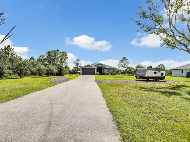Discover this nearly new move-in ready gem featuring 4 bedrooms and 2 baths, perfectly situated on 2.73 acres in Golden Gate Estates. This spacious home offers a 2-car garage, tray ceilings, and luxury plank vinyl flooring throughout. The split bedroom floor plan ensures privacy, while the open kitchen boasts plenty of cabinet space, quartz countertops, stainless steel appliances, a breakfast bar, an eat-in kitchen and a formal dining area. Some of the other fabulous highlights of this home include crown molding, tray ceilings, recessed lighting, ceiling fans, window treatments and a whole house reverse osmosis system. Enjoy your own private outdoor retreat where you can relax in the screened lanai or take advantage of the large patio sitting under the pergola soaking up the Florida sunshine and enjoying the serene and peaceful environment. Plenty of room for all your toys, trucks, trailers, boats, RV, and pets. The Sellers will be paying off the solar panels at closing so you can realize all the advantages of utilizing solar energy at no additional cost to you. (CURRENT OWNER INDICATED THEY ARE PAYING ONLY $22 A MONTH FOR ELECTRIC.) Located just 7.5 miles to the Publix shopping Center at Orangetree, 10 miles the Arthrex in Ave Maria, 13 miles to Immokalee, and 23 miles to the beach you can get where you want in minutes. Schedule your private showing before this one goes under contract!