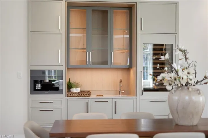 A masterfully crafted collaboration between Jeffrey Fisher Home, renowned architect JMDG, and the highly respected Waterside Builders; this newly completed Olde Naples residence blends elevated design with luxurious livability—just four blocks to the beach and two blocks from the charm of 3rd Street South. Every element of the home reflects attention to detail and timeless sophistication: European white oak floors, custom cabinetry and millwork, floor-to-ceiling glass, and intricate stained oak architectural ceilings. The open-concept floor plan flows through a sunlit study, elegant dining space, and stunning backlit bar into a designer kitchen outfitted with Miele, Wolf, and Sub-Zero appliances, plus a walk in pantry and first-floor laundry. The first-floor primary suite is a true retreat with immediate access to the pool and outdoor living areas. Framed by impact sliders, the living room opens to multiple covered spaces and a plunge / dipping pool and spa. A full summer kitchen and expansive outdoor deck make entertaining effortless. Upstairs offers exceptional flexibility and privacy with three en-suite bedrooms, a large bonus room, a second laundry, and a VIP guest suite. Control4 home automation, generator, natural gas, and electric roll-down screens and shutters provide ultimate comfort, security, and convenience. Positioned in one of the most sought-after pockets of Olde Naples, this bespoke property is a rare opportunity to own a truly exceptional new-construction home—steps from the Gulf, fine dining, and world-class shopping.