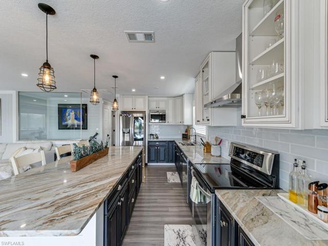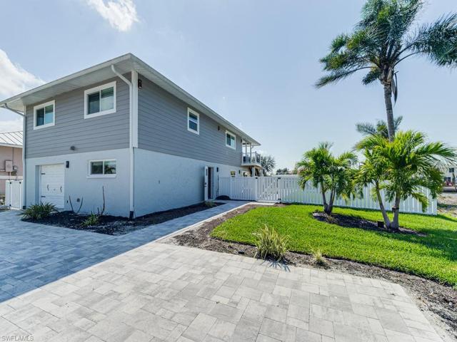 H9057. Gulf access gem, within walking distance to Barefoot Beach. The backyard entertaining area is 2nd to none. This wide canal property has been used as a primary residence and rented AirBnB for $16-20,000/month by prior owner. Pool and tiki hut overlooking the canal have all been redone and make this the perfect entertaining paradise. The seawall is in excellent condition. Additionally, there is a 10,000-pound boat lift, with new motors and new jet ski lift. Outside entertaining area is impeccable. The 2nd floor features two phenomenal bedrooms/two bathrooms with an open floor plan and custom finishes.