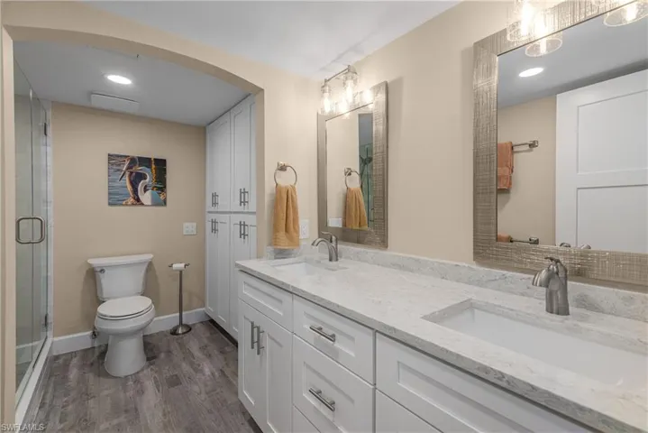 This unit has recently undergone a complete professional interior remodel, and truly no detail has been overlooked. Some of the many updates include luxury vinyl plank flooring throughout, custom white shaker cabinetry, upgraded quartz countertops, Whirlpool stainless steel appliances, an LG stackable washer and dryer, tiled showers with frameless glass enclosures, solid-core interior doors, fresh paint, designer lighting and ceiling fans, and custom Hunter Douglas interior shutters with a VerdiGlide pleated shade and custom drapery panels.