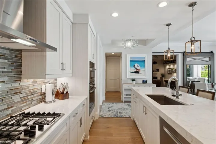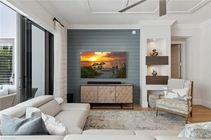 Arguably the best location within Naples Square 3, this Chatham floor plan features a massive terrace on the pool deck level overlooking the lush courtyard. This fully furnished west-facing home features a full NanaWall of sliding glass doors to the terrace. The center-island kitchen features Bosch appliances and great storage. The den includes a barn door and Murphy bed, effectively making this a three-bedroom home. The split bedroom configuration includes a generous primary suite with two closets, and a large bath including a double vanity, glass shower, and a soaking tub. The second bedroom is also ensuite. The laundry room is large, well-organized, and has plenty of cabinetry for storage. Naples Square residents enjoy amenities including a pool, spa, covered outdoor grilling area, two firepits, a large party room with billiards, and a state-of-the-art gym. Just a short walk to the shops and restaurants on 5th Avenue, the beach or the farmers market and dining on 3rd Street.