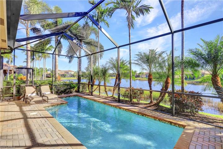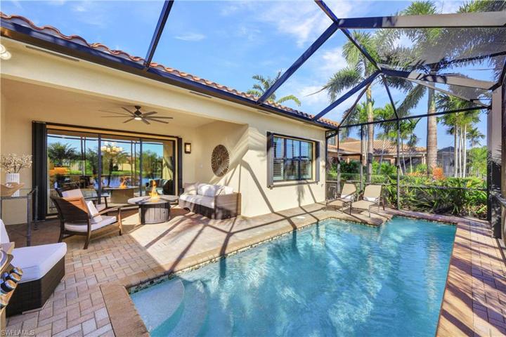 Enjoy an amenity rich resort lifestyle in a low maintenance Villa boasting a PRIVATE POOL surrounded by lush tropical landscaping and a fabulous lake view. As a GL Homes model, this villa was beautifully decorated and appointed with many upgrades. Chef inspired kitchen is appointed with high end SS appliances, quartz countertops and backsplash. Volume ceilings accented with crown molding, designer fixtures, and recessed lighting along with wall accents and wood detailing. Spacious owner’s suite has luxurious spa inspired ensuite bath with dual vanities and walk in shower. Office/den featuring built in desk and cabinetry creating a work from home environment. Bright, light infused open floor plan is perfect for entertaining and transitions seamlessly to indoor-outdoor living. Marina Bay offers 3 community pools, spa, pickleball, tennis, fitness center, indoor & outdoor basketball, billiards room, community rooms for parties and social activities. Excellent location off of Treeline in the Daniels Pkwy Corridor with easy access to I-75, SWFL Int. Airport, Gulf Coast Town Center, & FGCU. World renowned beaches, shopping & restaurants nearby.