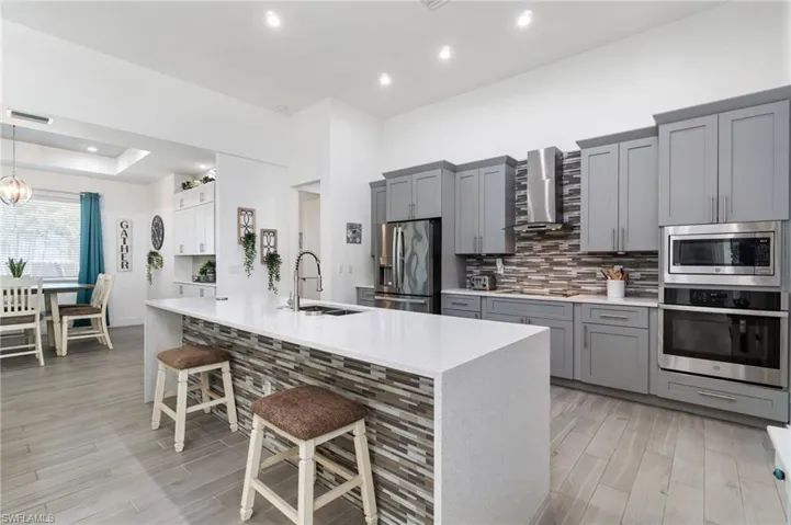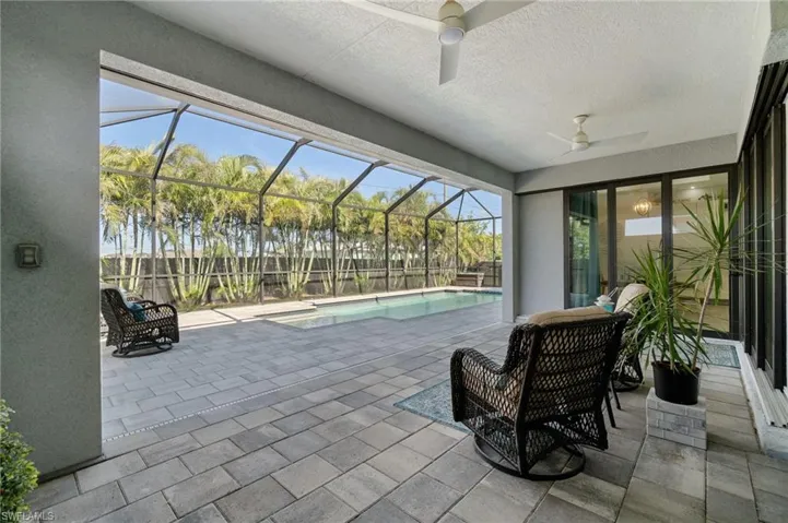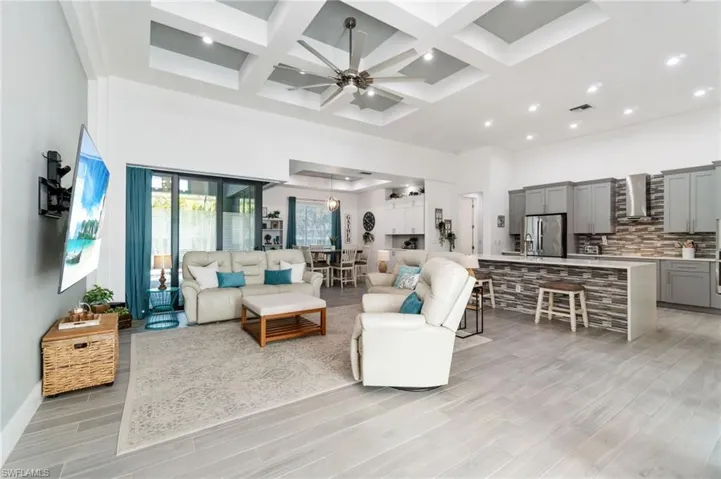 Welcome to this beautifully appointed 3-bedroom, 3-bathroom plus den home in the heart of Cape Coral, where comfort, elegance, and Florida living come together seamlessly. From the moment you arrive, you’ll be captivated by the home’s curb appeal, featuring lush tropical landscaping, a stately 3-car garage, and grand double entry doors. Inside, soaring ceilings and upscale finishes set the tone. Coffered ceilings in the living room, tray ceilings in the dining room and primary bedroom, along with tile floors throughout, add a touch of refined sophistication The dining area has been thoughtfully enhanced with new built-in cabinetry, adding both style and functionality. The primary suite is a private retreat, complete with his-and-hers walk-in closets, direct access to the lanai, and a spa-like ensuite bathroom featuring a seamless-entry shower and a newly installed soaking tub. The spacious layout is ideal for both everyday living and entertaining, with zero-corner sliding glass doors in the main living area that open fully to the screened lanai. Here, you can enjoy true indoor-outdoor living, relaxing or hosting guests by the sparkling saltwater pool, all within the privacy of your fully fenced backyard. Perfectly located in Cape Coral, this home offers easy access to local dining, shopping, and entertainment, making it the ideal place to enjoy the best of Southwest Florida.