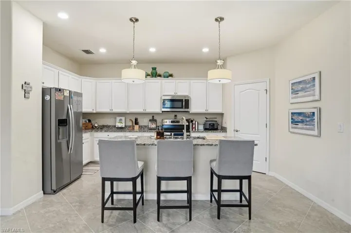 At the heart of the home is the extra large great room seamlessly connected to the open concept kitchen, making it perfect for entertaining guests or enjoying everyday moments. White shaker cabinetry, granite countertops, and a spacious walk in pantry with practical storage. Pocket sliding glass doors extend your living space to the covered lanai, offering the perfect setting for morning coffee, evening relaxation, or hosting friends in the Florida breeze.