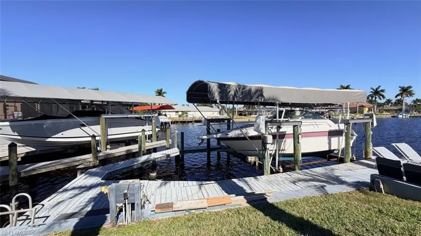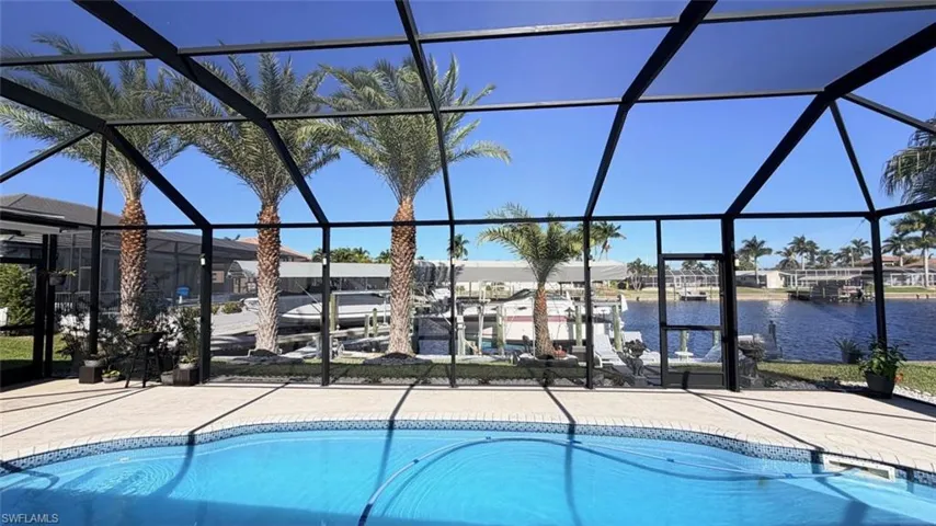 Welcome to this prime waterfront location in the highly sought after SE Cape Coral. Beautiful upgraded saltwater pool home with direct gulf access in minutes on a wide and deep canal that can even accommodate a sailboat. You will definitely love this residence with 3 bedrooms, den/office and a large gourmet kitchen. The house was recently remodeled including bathrooms, new kitchen with stainless steel appliances and new flooring. Impact resistance entrance and sliding doors. New roof was installed in 2022, CPVC repiping was sone in 2015 and new A/C unit installed in 2020. Step outside in the large, screened lanai and relax by your pool or soak in the luxurious hot tub. Enough room to entertain your friends and family for a big celebration after moving in. This is your dream home if you love boating as you will enjoy the private, covered dock with 4 motors powered lift. Extraordinary day and night views will make you fully enjoy the time spend outside. The house was not affected by any hurricane besides some roof damage, which was totally replaced. Come and see it and I am sure you will love to call it HOME.