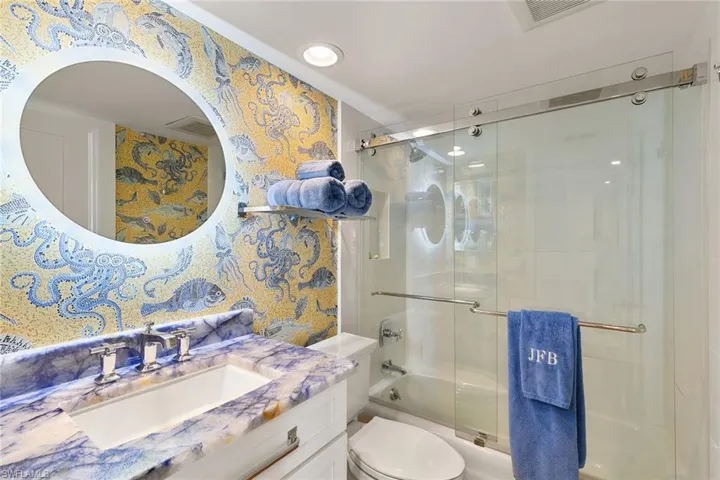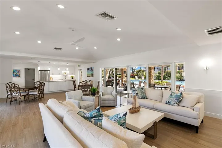 This condominium is south of Doctors Pass and just 60 steps to the beach! The newly renovated two-bedroom, two-bath condominium has an open floor plan, floor-to-ceiling wall of sliding windows, wood floors, tall ceilings and a one-car enclosed garage. The kitchen has a pantry, Sub-Zero refrigerator, dishwasher drawers, wine refrigerator, range and large stainless-steel sink with disposal. Primary bedroom has a king bed, walk-in closet, and two additional closets plus en-suite bath with walk-in shower. The guest room has a queen bed with en-suite guest bath with shower and tub. In-unit laundry makes it a great place to live. Rare opportunity to own two connecting condominiums because 2201 Gulf Shore Blvd. N unit E1 is also for sale. Both are completely remodeled first-floor condominiums with a hotel-style door between the two units that can be locked so you have two 1,500-square-foot two-bedroom, two-bath condominiums or opened up, so you have one 3,000-square-foot condominium with four bedrooms and four baths. Interior of units has never had damage from hurricanes! Remodeled clubhouse, complete with full kitchen, has a beautiful pool with outdoor grilling area, ice machine, plus boat slips for rent. Famous Fifth Ave South is only 2.3 miles away.