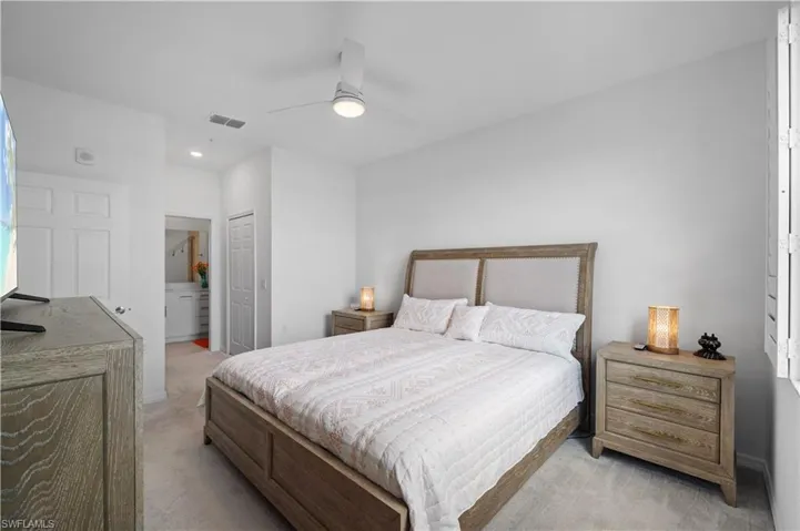 Beautiful quartz countertops and light-colored tiled floors highlight this stunning space, which features plantation shutters and a “Storm Smart” remote screen on the screened-in Lanai. Enjoy views of the second hole and one of the many lakes in Babcock Ranch. The home includes four ceiling fans and custom lighting throughout. The kitchen is equipped with stainless steel appliances, ample cabinet and counter space, a center island breakfast bar, additional counter seating, and a dining area. The living area flows seamlessly into the kitchen and Lanai, making it perfect for entertaining.