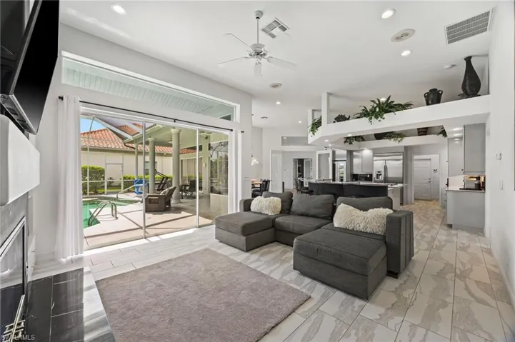 Stunning and immaculately kept, this spacious 3-bedroom plus den, 3 bath home offers 3,144 square feet of refined living in the highly desirable Olde Hickory Golf & Country Club. Upon entry, you are welcomed into a large living and formal dining area with a picturesque wide lake view, setting the tone for the home’s elegant yet comfortable design. French doors lead to an oversized kitchen with abundant cabinetry, island glass-top range, tiled backsplash, and breakfast bar overlooking the eat-in kitchen and family room. Large picture windows and sliding doors allow you to enjoy the serene lake views from nearly every room. The den features custom built-in cabinets and desk, perfect for a home office or flex space. The expansive master suite includes a luxurious bath with dual sinks, vanity area, step-in jetted tub, and large walk-in shower. Two generously sized guest bedrooms and baths provide comfort for visitors, with one bath serving as a convenient pool bath. Step outside to the screened lanai and take in peaceful lake views while enjoying the in-ground pool and spa, highlighted by a unique in-water swim-up bar with seating, a new pool cage with picture window screen, and beautiful Florida weather year-round. This home offers exceptional peace of mind with two new A/C units, a new water heater, and a whole-house re-pipe. Olde Hickory is a bundled golf community featuring an 18-hole championship golf course, golf shop, fitness center, active tennis and pickleball programs, clubhouse with pool, spa, sauna, library, poolside and outdoor dining, bar lounge, and a 24-hour manned guard gate. Ideally located near major league baseball training facilities, I-75, Southwest Florida International Airport, and a wide array of shopping, dining, and outdoor recreation, this exceptional home offers the perfect balance of peaceful golf course living and everyday convenience—an inviting retreat where Florida’s relaxed luxury lifestyle truly comes to life.