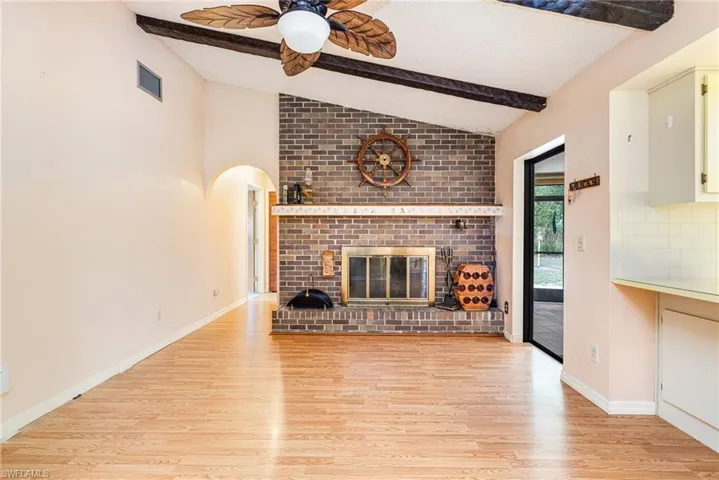Showcasing a charming brick fireplace and a beamed, vaulted ceiling, this welcoming home offers character and comfort from the moment you step inside, with a bright all-white kitchen that opens easily to everyday living, a formal dining area ideal for gatherings, and a spacious screened patio overlooking a generous backyard with ample room to add a pool, all with no HOA fees to limit your lifestyle. Offered for the first time, this 3-bedroom, 2-bath residence with a 2-car garage is set on nearly a quarter-acre in the heart of Cape Coral and presents a versatile opportunity whether you’re entering the market, seeking a seasonal getaway, or adding a rental investment with long-term upside. The home is move-in ready and further enhanced by a newer AC system, a newer roof, an updated garage door, and a freshly painted driveway, while still allowing plenty of flexibility to update, personalize, and create your own vision over time. Outdoors, the oversized yard provides space to entertain, garden, or expand, and includes a convenient storage shed perfect for tools, water toys, bikes, or extra gear. Living in Cape Coral means embracing a water-inspired lifestyle shaped by one of the largest canal systems in the world, where boating, kayaking, paddleboarding, fishing, and sunset cruises are part of everyday life, creating a relaxed, outdoor-focused atmosphere residents love. Miles of scenic waterways weave throughout the city, complemented by bike-friendly streets, nearby parks, local marinas, dining, and shopping that make day-to-day living both convenient and enjoyable. Ideally located just off Santa Barbara Boulevard with quick access to the Midpoint Bridge, this home places you minutes from schools, grocery stores, dining, shopping, and an easy commute into Fort Myers, all while remaining affordable and flexible for a variety of lifestyles. This is a rare chance to secure a well-located Cape Coral home with space, potential, and freedom from HOA restrictions, and an ideal foundation to enjoy the very best of Southwest Florida living. Some photos virtually staged for design inspiration.