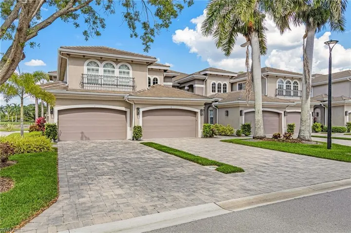 Beautifully renovated, turn-key furnished carriage home in the Triana neighborhood of The Club at Renaissance — one of South Fort Myers’ most sought-after private golf communities. This exceptional second-floor residence offers 2,802 sq ft of refined living with golf course and lake views. The ground level features a private entry, two-car garage, and your choice of an elegant wrought iron staircase or private elevator to the main living floor. Upstairs, soaring ceilings and a dramatic arched colonnade with decorative columns define the open great room, which flows to the screened lanai overlooking the Arthur Hills championship course. The lanai is equipped with electric roll-down storm shutters for year-round convenience. The renovated kitchen features white raised-panel cabinetry with gold hardware, quartz countertops, geometric tile backsplash, under-cabinet lighting, stainless appliances, and a peninsula with bar seating. A breakfast nook with corner windows frames golf course views. The utility room offers a front-load washer and dryer, quartz countertops, utility sink, and ample cabinetry. The primary suite features a walk-in closet, tray ceiling, hardwood floors, and golf course views. The en-suite bath includes a double vanity with granite countertops, soaking tub, and walk-in glass shower. Two guest bedrooms offer tray ceilings, hardwood floors, and plantation shutters. The den is an ideal home office. The oversized media room features triple arched windows, plantation shutters, a built-in bar with wine cooler, and hardwood floors. The Club at Renaissance is a private, gated community on 500+ acres featuring an Arthur Hills championship golf course, resort-style pool and pavilion, full-service spa and fitness center, six red clay tennis courts, two pickleball courts, two bocce courts, and a children’s play area. Year-round dining and social programming complete the lifestyle.
