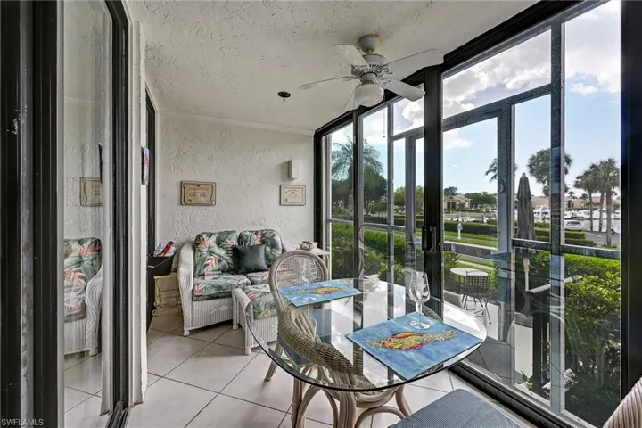 THIS ANNUAL LISTING is located on the first floor walk-out corner unit with lots of sun and terrific views! Enjoy AMAZING Sunsets from the screened lanai and the open patio, overlooking the river and Gulf-access marina. Updated kitchen and baths, bonus room with a pool and lake view, storm protection, and an under-building parking spot. The Landings Yacht Golf and Tennis Club is one of the most prestigious gated communities off historic McGregor Blvd, close to beaches, restaurants, arts & entertainment. Enjoy included amenities for two: unlimited golf, tennis, pickleball, bocce, two dining venues with daily specials and happy hour, social clubs, swimming, fitness center and more – come live the good life! A boat slip is included, too, based on wait list, or take out the rental boat!! AVAILABLE MAY 1ST 2026