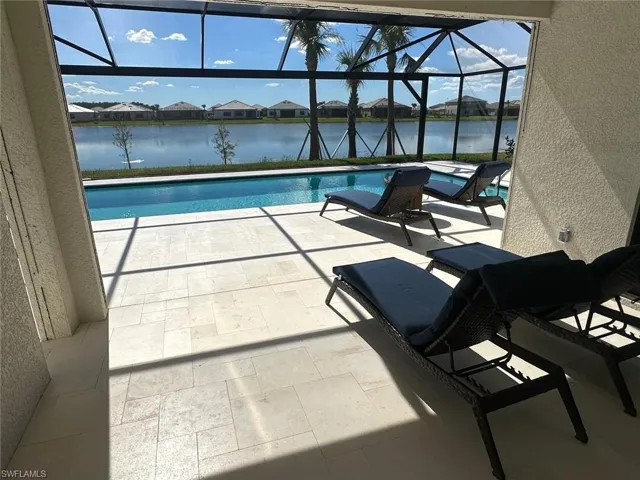 Outdoor Living: A massive screened lanai featuring a private pool and spillover spa, all overlooking a serene, expansive lake view.
