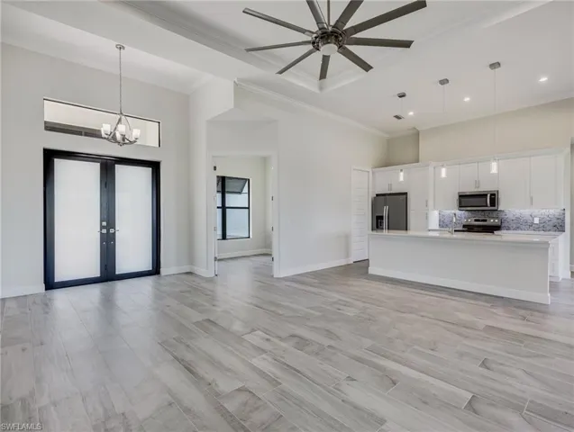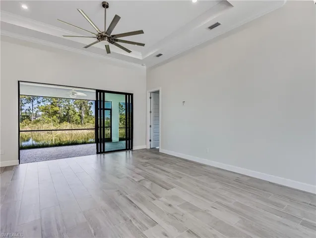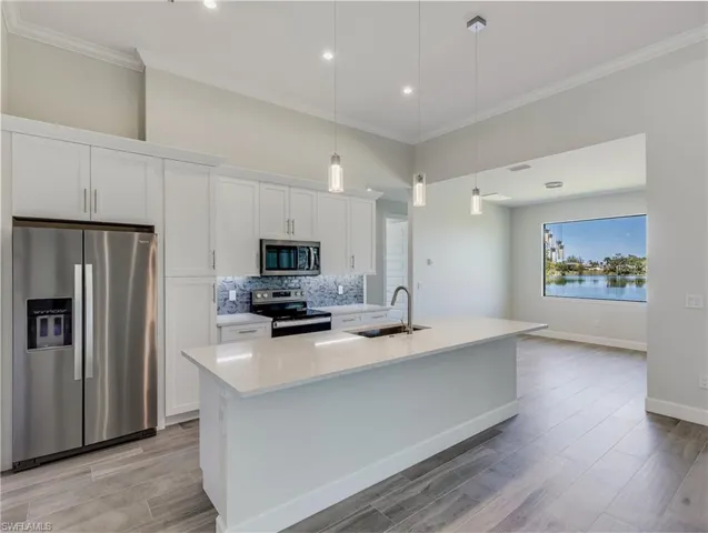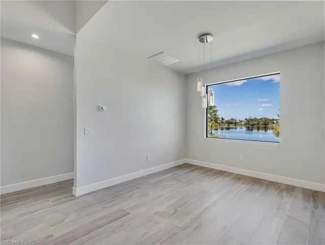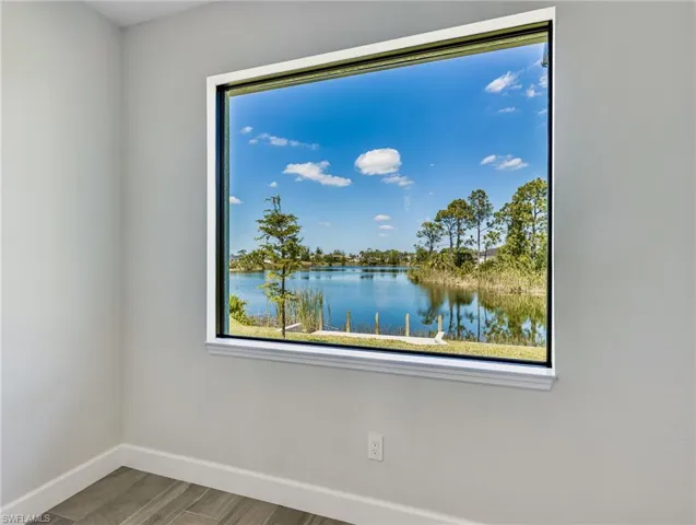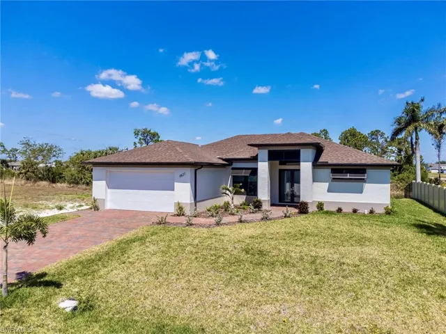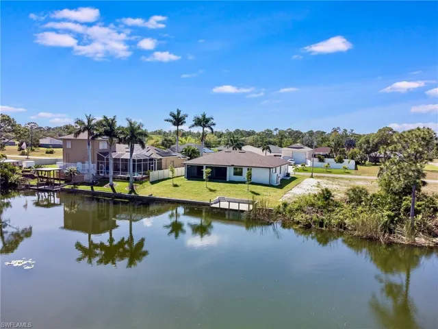 Waterfront AND New Construction, never lived in – it doesn’t get any better than this! Beautiful, serene views of Mull Lake from all corners of this 3 bedroom + Den, 2 Bath home in the thriving Northeast section of Cape Coral! Not your typical new construction with typical builder grade finishes – this home was built with attention to detail and premium upgrades -porcelain tile floors, crown molding, 8′ 6 panel doors, quartz countertops, impact windows (picture windows) and doors (double door entry), reverse osmosis water system, marble window sills, designer light fixtures and ceiling fans, decorative Bahama shutters . The Primary Suite features gorgeous lake views, 2 walk-in closets and the Bath has a modern soaking tub, dual vanities, private commode, and custom niches and lighting in the oversized rain shower. The Great Room has a wall of sliders that open to the generously sized, pavered, screened Lanai – plenty of room to add a pool if desired. In fact, the Guest Bath has been oriented as a future pool bath. Bonus – there’s a concrete dock and seawall and miles of canals ready to be explored by kayak or boat, or spend the day fishing in your own backyard! Enjoy gorgeous sunsets from your Lanai and absorb the sights and sounds of all types of wildlife. The Kitchen opens to the Great Room with a center island, stainless steel appliances, and Dining Area. The 2 car garage offers epoxy floors. Colorful bushes, flowers and palm trees complement the landscaping. While the setting is peaceful, you’re still close to everything you need – schools, shopping, restaurants, medical. Quality, style, and tranquility all in one package!