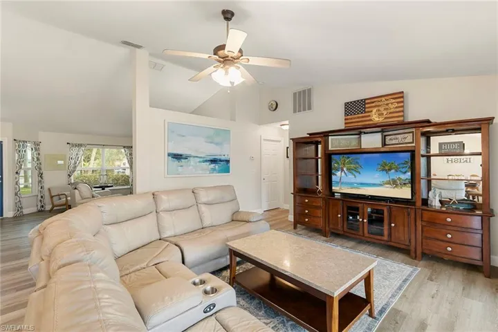 Welcome to a community designed for an active outdoor lifestyle, featuring sidewalks for recreation and biking with convenient access to nearby beach activities. Ideally in a prime Naples area, the neighborhood offers low HOA fees and amenities, including a clubhouse, tennis and pickleball courts, and a community pool. This thoughtfully updated home features three bedrooms plus a den, enclosed from the original dining area to provide flexible living space. The open concept layout flows into a modern kitchen with custom cabinetry, granite countertops, a breakfast bar, and pantry, well-suited for everyday living and casual entertaining. An oversized lanai with pocket sliding glass doors creates a seamless indoor-outdoor connection and offers peaceful lake views. The lake supports catch-and-release fishing and is home to turtles and local wildlife. The expansive, irrigated yard provides ample space for a future pool, enhancing outdoor living options. Recent improvements include a new roof with a 10-year, one-time transferable warranty, luxury vinyl flooring throughout, updated indoor polyethylene plumbing (approximately four years), hurricane-resistant windows in front and all bedrooms, fresh interior paint in most rooms, refinished cabinets and a freshly painted exterior with decorative shutters. Outdoor features include a spacious exterior, and a refreshing cold water shower, ideal after beach or boat days and convenient for rinsing off pets. The home offers a balanced combination of functionality, durability and lifestyle appeal in a community that welcomes children, pets and active living. The property is seven miles from downtown Naples 5th Avenue and 3rd Street, offering shopping and dining, with grocery stores, healthcare and fitness facilities nearby.