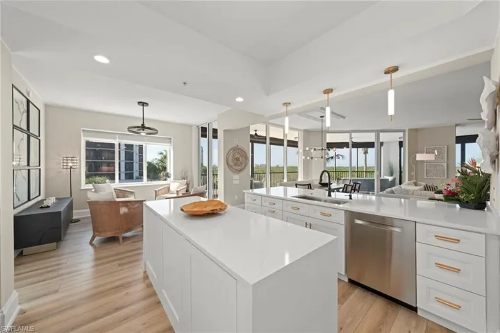 This fully renovated, second-floor end residence in Castella at The Colony presents a refined alternative to Gulf-front high-rise living, offering luxury finishes, privacy and ease of ownership, paired with exclusive access to The Colony’s private Bay Club on Estero Bay. Thoughtfully redesigned with elevated architectural detailing and high-end materials throughout, the residence is filled with natural light enhanced by its desirable corner location. The open living and dining areas flow seamlessly, creating a relaxed yet sophisticated setting ideal for entertaining after a day at the beach. The chef’s kitchen rivals those found in other premier residences, anchored by a striking one-piece quartz sink and countertop and a dramatic waterfall quartz island with three integrated wine and beverage coolers. Professional-grade appliances include a Sub-Zero refrigerator, Wolf double ovens, microwave and induction cooktop, a Zephyr range hood and a Bosch dishwasher, all new in 2020. A touchless faucet, custom lighting and refined finishes complete the space. The primary suite is a serene, spa-like retreat, featuring porcelain countertops and floor-to-ceiling porcelain shower walls in the bath, with a separate luxurious soaking tub, a statement piece, delivering a clean, modern aesthetic inspired by coastal resort living. Throughout the residence, 8-inch floor moldings, custom window and door wall treatments, dimmable lighting, and designer lighting and fans reflect a meticulous attention to detail. Comfort and peace of mind are ensured with dual HVAC systems replaced in late 2022, each enhanced with ultraviolet air purification, along with a Phyn Wi-Fi water shutoff and leak detection system, and full-house hot water circulation for instant hot water. Window tinting on east, south and west exposures enhances energy efficiency while maintaining bright, natural interiors. A new double entrance door installed in 2025 creates an elegant arrival, while curated furnishings from Ethan Allen, Arhaus and Restoration Hardware further elevate the home’s appeal. Castella offers a boutique, resort-style lifestyle with a resort-style private pool with beach entry, fire pit, grills and social pavilion. Residents at The Colony enjoy access to The Bay Club, offering private waterfront dining and a private beach island just a short boat trip away. Shopping and dining are available at Coconut Point and Southwest Florida International Airport is a quick 30-minute drive away. Live your best luxury lifestyle with a private island beach, fitness, tennis, pickleball, bocce, canoe and kayak park, and more, all included for no additional fees. Two golf courses offer optional membership opportunities, so please contact the membership directors for pricing and availability.