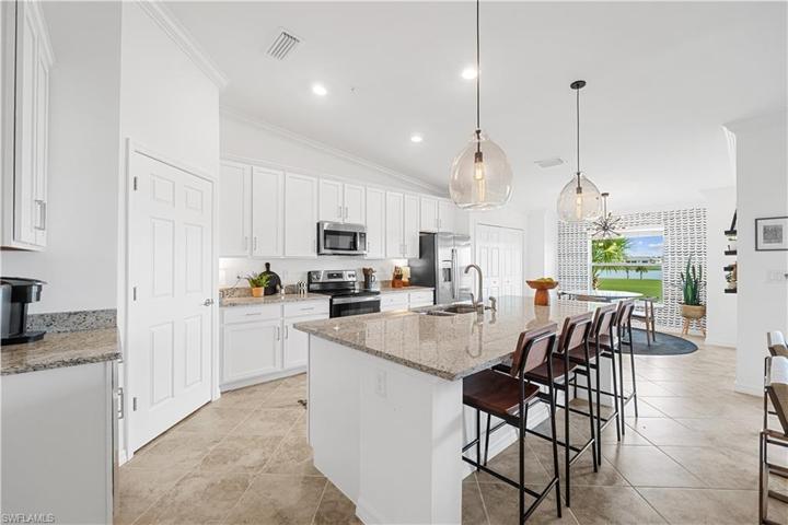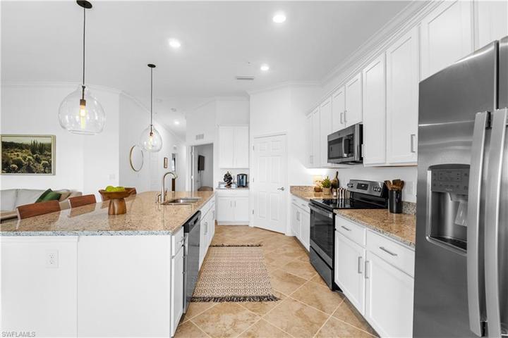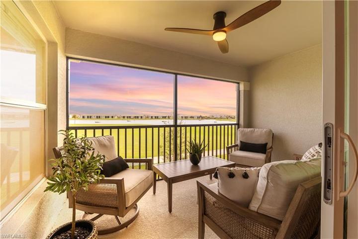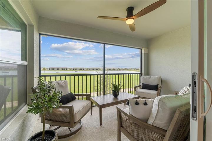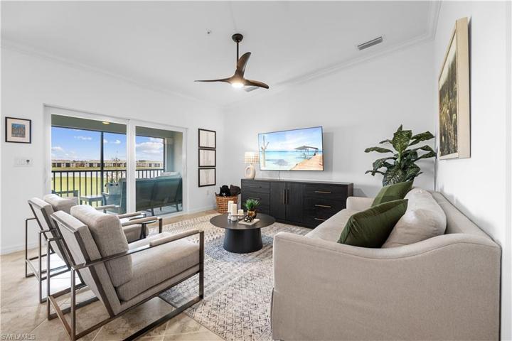 Welcome to luxury living in this second-floor DiAngello model in BABCOCK RANCH WITH BUNDLED GOLF MEMBERSHIP INCLUDED with unparalleled view of the lush golf course, providing a serene backdrop to your everyday life. The vaulted high ceilings amplify the sense of space and openness. The heart of the home boasts a large kitchen with a sprawling center island and stainless steel appliances. This tastefully designed residence features 2 bedrooms a den and two full bathroom with a 1 car garage. The modern flair throughout the home adds a touch of sophistication. Additionally, there are four TV wall mounts strategically placed and new ceiling fans in every room. The sale of this property comes with the option to negotiate the inclusion of furniture and TVs, allowing you to seamlessly transition into your new home. Come live where luxury, comfort, and breathtaking views converge in perfect harmony. World-class amenities include 18 hole golf course, tennis, pickle ball and bocce ball courts. Resort style pool and spa with lap pool surrounding the Watershed Grill restaurant and Tiki Bar adjacent to the athletic Center and Day spa makes this an amazing resort lifestyle.