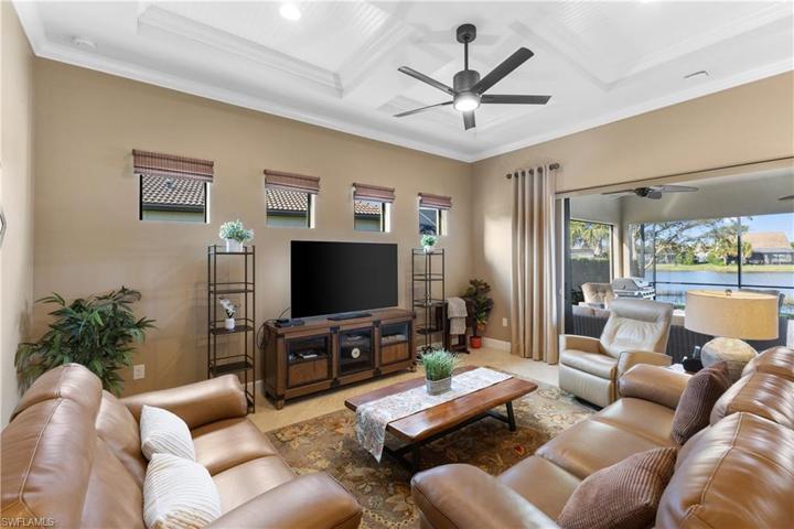 Rarely offered as a four-bedroom, this Summerwood floorplan by Pulte Homes is being offered turnkey furnished. It is positioned on a private pie-shaped lot on the deepest part of the lake. The large lot allowed for desirable structural upgrades such as the 4-foot garage extension with epoxy floors, upgraded front elevation with front porch and complimented by the extended lanai option, which offers expansive waterfront views. The entire home features hurricane-impact glass windows and sliders, including the zero corner pocketing sliding glass doors – arguably the most sought-after upgrade in the community. Inside, the home is very well-appointed, highlighted by large format tile throughout, crown moldings, plantation shutters, 8-foot door casings, motorized window coverings, and Hunter Douglas verticle shades. Meticulously maintained and perfect for the most discerning buyers, this home is located in the desirable community of Corkscrew Shores, offering an array of amenities, including a resort-style pool, sports facilities, and dining with NO CDD fees.