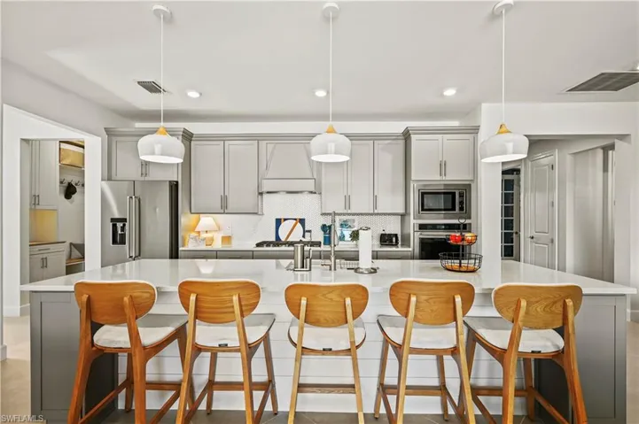 At the center of the home is a gourmet-style kitchen featuring built-in appliances, quartz countertops, and an extended island with additional end-cap cabinetry for enhanced storage and functionality. A custom bar build-out just off the kitchen and living area includes a built-in beverage chiller, creating an ideal space for entertaining.