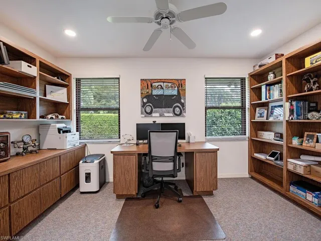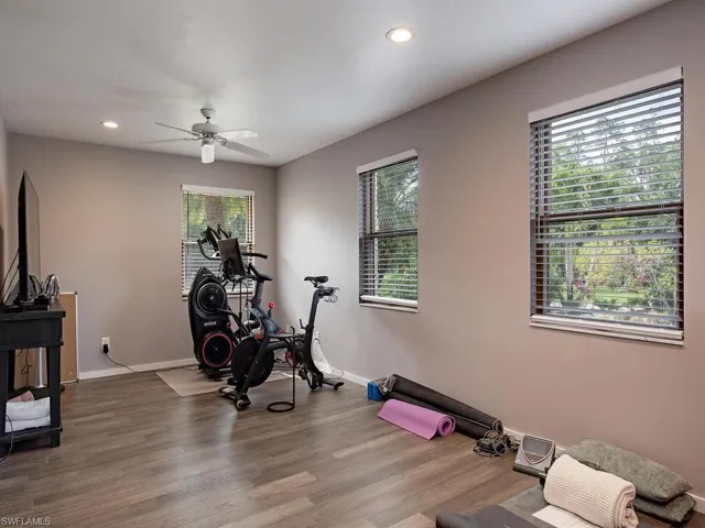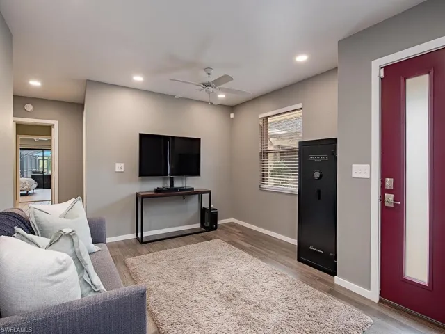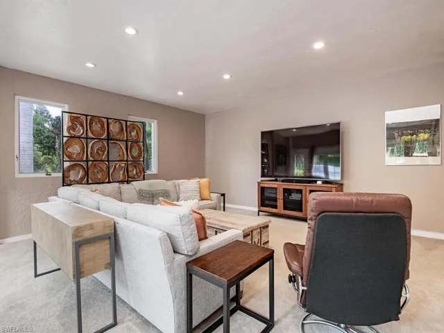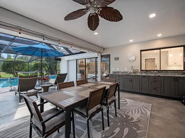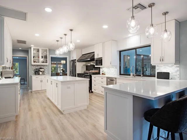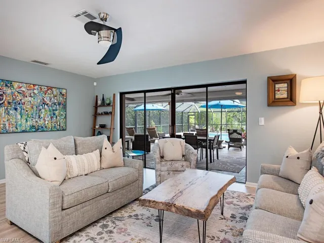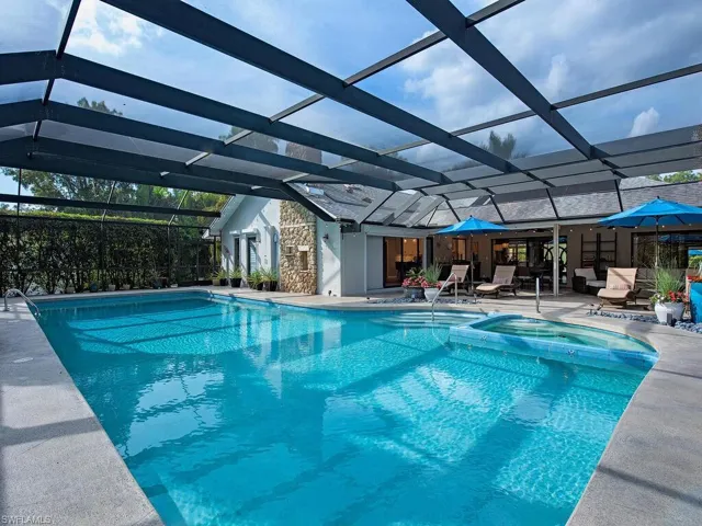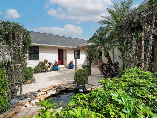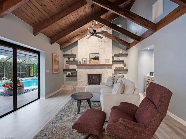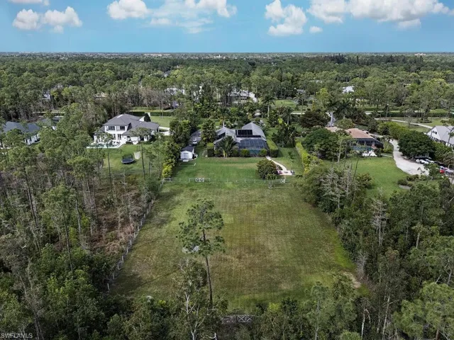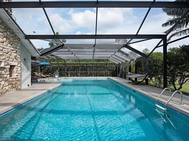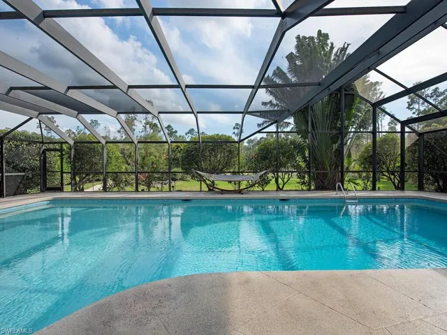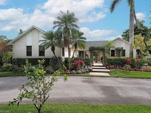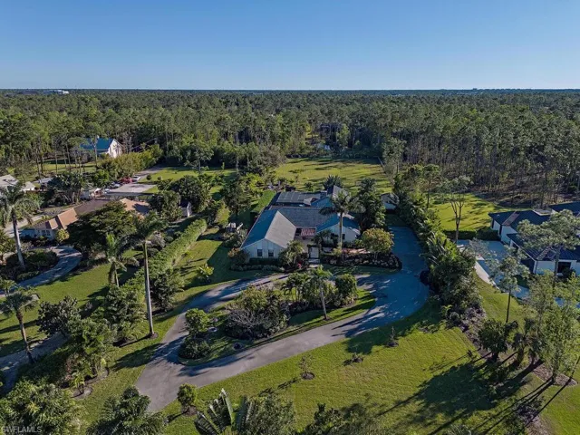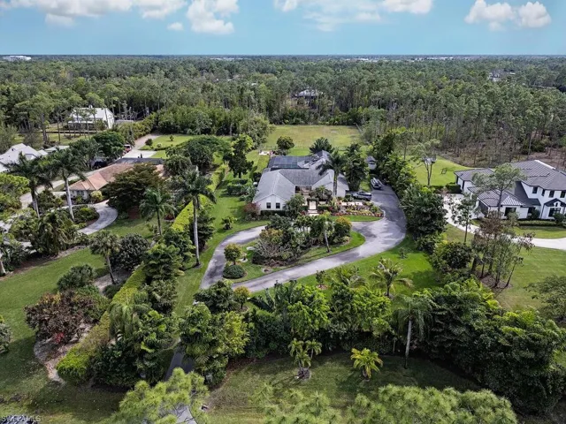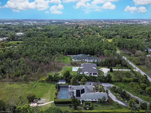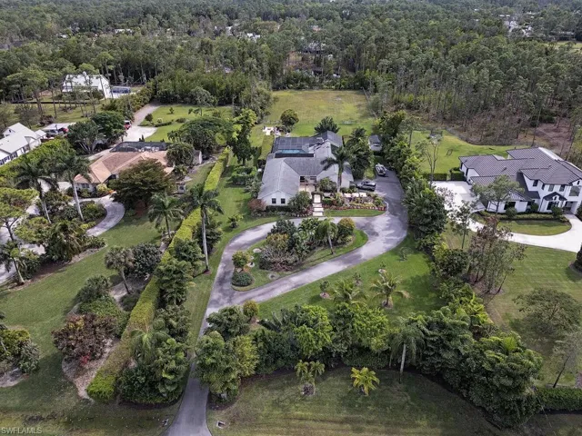 NO HURRICANE DAMAGE! Magnificent estate home on 2.5 acre upland dry lot in highly desirable Livingston Woods! This beautiful move-in ready estate property is a lush private oasis featuring an extensive gorgeous landscaping package with lush foliage and updated irrigation system. Dwarf coconut, avocado, banana, lemon, orange, cherry, mandarin, and lime fruit trees can be found throughout the property in addition to two ponds, pergola, water features, fire pit, and cleared manicured grounds including fenced 1-acre for pets to run freely. The interior of the residence has been updated to showcase modern features such as stunning quartz countertops, elegant fixtures, modern flooring, large kitchen island, and commercial oven/cooktop. Additionally, the following items are new as of 2023: reverse osmosis system, two hot water heaters, Bosch dishwasher, formal dining room chandelier, and pool pump. The property’s also has newer HVAC systems and the well also receives monthly inspections from Golden Gate Well. Residence is being offered with $100,000 all American-made furnishings package from Room & Board, Lexington, solid wood furniture, Bassett, Paul Robert. Other interior attributes include exposed ceiling beams, gas fireplace with stone accents, and multiple offices/guest suites with separate entrance and secured safe room. This is an entertainer’s dream with an expansive entertaining and outdoor living area featuring a summer kitchen, multiple outdoor living areas and an oversized 8-foot deep pool/spa surrounded by tropical landscaping with pot watering systems. The residence is finished with 3 HVAC systems and a separate hurricane-rated workshop. Livingston woods provides private acreage while being conveniently located just minutes from Pine Ridge Road, I-75, and the shopping, dining, and entertainment of Mercato Shops.