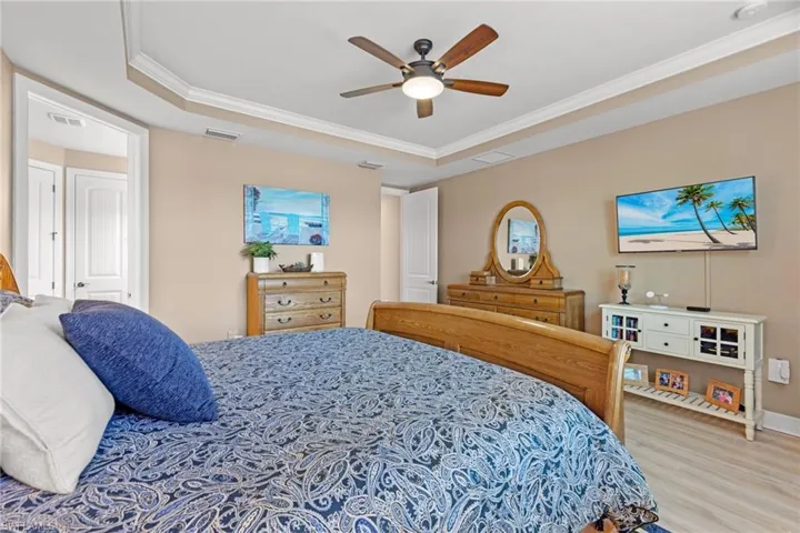 As you step ino the Foyer of this spectacular 2BR + Den/2BA house, don’t miss the glass Front Entry Door or the sliding Screen Door. You will immediatly notice the Den with large windows, crown molding, manufactured hardwood floors and French Doors providing space for the perfect Home Office. The Kitchen features upgraded cabinets with lower cabinet pullouts, upgraded appliances and a large island. The nearby walk-in pantry and beverage center complete this ideal Kitchen. You’re going to love the long lake view through the Living Room pocket sliders and panoramic screen on the extended Lanai. This Martin Ray plan home boasts a spacious Primary Bedroom with a tray ceiling and crown molding. There is an ensuite Bathroom with an extended shower, dual sinks and abundant storagein the walk-in closet. The 2nd Bedroom provides plenty of space for family and friends. Don’t miss the tandem Garage with a 4 ft extension, pull-down stairs to amazing attic storage, epoxy floors and a generator adapter. Rest easy with new AC in 2022, a new hot water heater in 2022, a Kinetico water system added in 2021 and Storm Smart accordion shutters and screens. Bridgetown Amenities include a clubhouse, resort style pool, chilled lap pool, bocce, pickleball, tennis, a play area and BBQ/fire pit for gathering with friends and family. Call today to make an appointment to see this beatuful house!