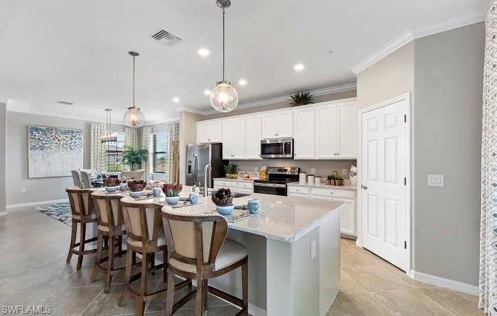 complemented by a bundled social membership in Ave Maria, FL. The National Golf & Country Club is situated between Florida National wildlife Preserve and Okaloacoochee Slough State Forest, both ideal for hiking and exploring nature. Ave Maria’s Town Center offers endless recreation, dining and shopping opportunities. As a golfer’s paradise, the community features a 18-hole golf course, a state-of-the-art clubhouse and other luxury amenities for residents to enjoy. This attached home is the largest plan in the collection. A two-car garage sits o